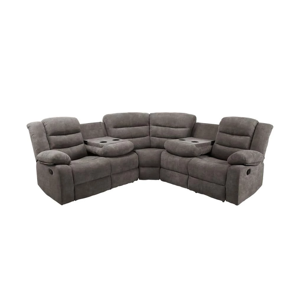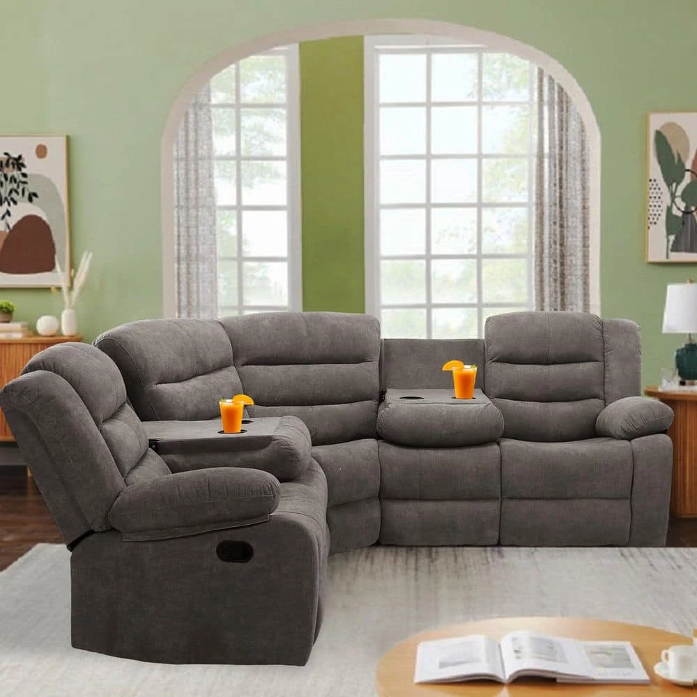 This combination manual recliner sofa is made of Solid plus Manufactured Wood plus Metal frame and Polyester Blend Upholstery Material, with a total of 5-seats, including 2-seats on the left, wedge, and 2-seats on the right, armchairs on the right and left can be reclined, armrest side pull buckle, manual Adjustment, can lie down 110° to 145° any position, the whole body relaxation, effective relief of back pressure, footstool from the front of the extension, allowing you to stretch your legs, promote healthy blood flow. This luxurious sofa will provide you with a good and comfortable sitting experience, with a weight capacity of up to 1200 lbs., and a durable and comfortable design that you can use without worry. The classic design of the manual reclining sofa is perfect for a stylish style living room, whether you are a movie buff or a TV show fan, watching your favorite shows has never been more satisfying with this perfect piece of modern furniture, this stylish manual reclining sofa is a great choice for gathering with family and friends.