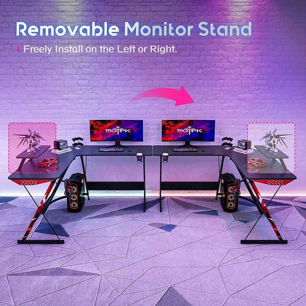 Game like a pro even in the smallest of spaces with the MOTPK 51-Inch L-Shaped Carbon Fiber Computer Gaming Desk with Raised Monitor Shelf. This gaming desk fits snuggly in the corner and is the perfect solution for gamers who want a full PC setup without a cluttered desktop.Ideal for gamers and active computer users, this desk provides style and unbeatable convenience. The sturdy Y-shaped metal frame with wire reinforcements keeps the desk stable while leaving enough room for your legs and to store your PC tower. Measuring 51-inches at the longest, the desk features a removable raised monitor shelf that can hold your monitor or be used as a display shelf.A built-in cupholder, headphone holder, and cable holes provide luxury convenience that makes it easy to keep your hands on the controller or keyboard. The carbon-fiber desktop provides a sleek look and is waterproof and resistant to wear, allowing you to enjoy this stylish desk for years to come. Adjustable feet allow you to adjust the height of the desk to fit your frame comfortably.Don’t compromise because of a lack of space. Enjoy gaming on the MOTPK L-Shaped Carbon Fiber Computer Gaming Desk.