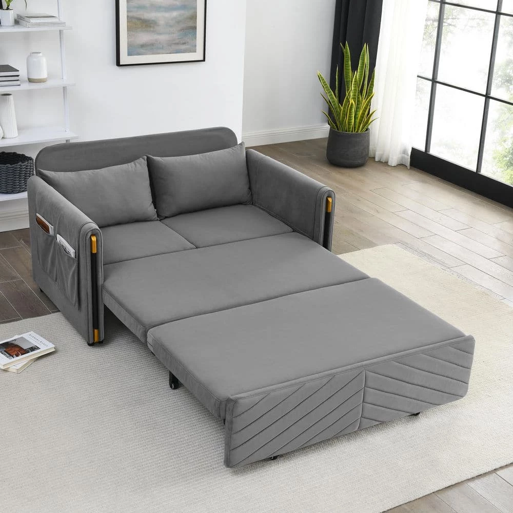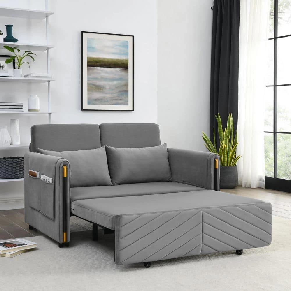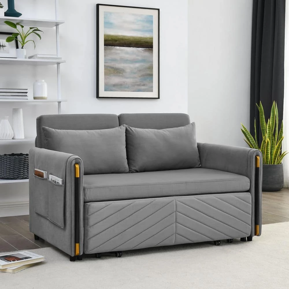 Multi-position adjustable pull-out sofa bed with bedhead, By pulling out the bed frame under the seat, this double position sofa can be quickly converted into a bed for resting use. Stretch out and relax on this handsome sofa. This velvet sofa bed features iron frame hinges and a sturdy wood frame so it will last a long time. Its vibrant velvet upholstery is a jewel tone that is simply stunning and adds a splash of color to your life. The sofa’s back cushions are plump and padded with quality materials to keep you rocking in comfort and it comes with 2 rolling pillows to help you prop up and relax.