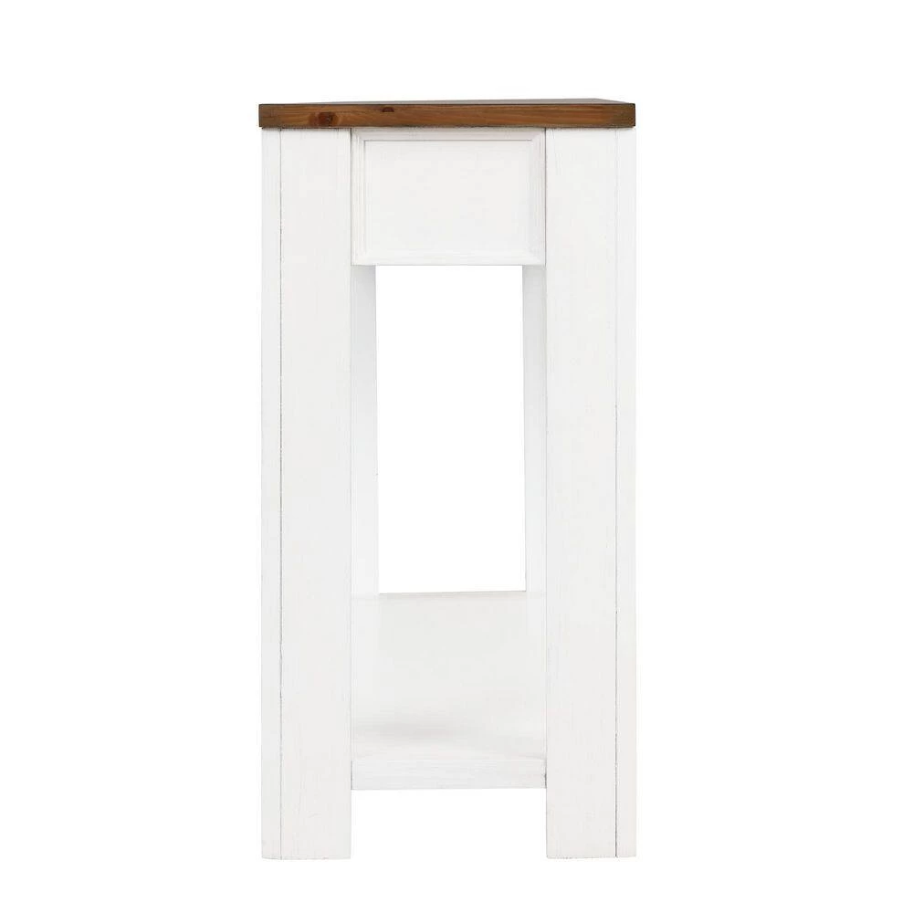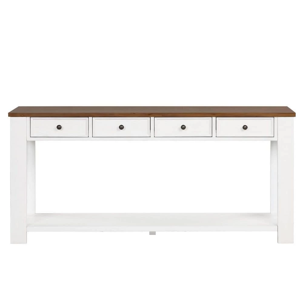 This console table is equipped with a 63 in. L table top to meet your various display needs. The color combination design of the brown top and the white table body makes your living room unique. All 4-drawers are equipped with retro handles, providing ideal storage for your daily necessities and saving space in your living room. Spacious shelves provide a satisfying area for your larger items such as books, storage box and baskets. Solid pine and high-quality MDF material ensure this table will last you a long time.