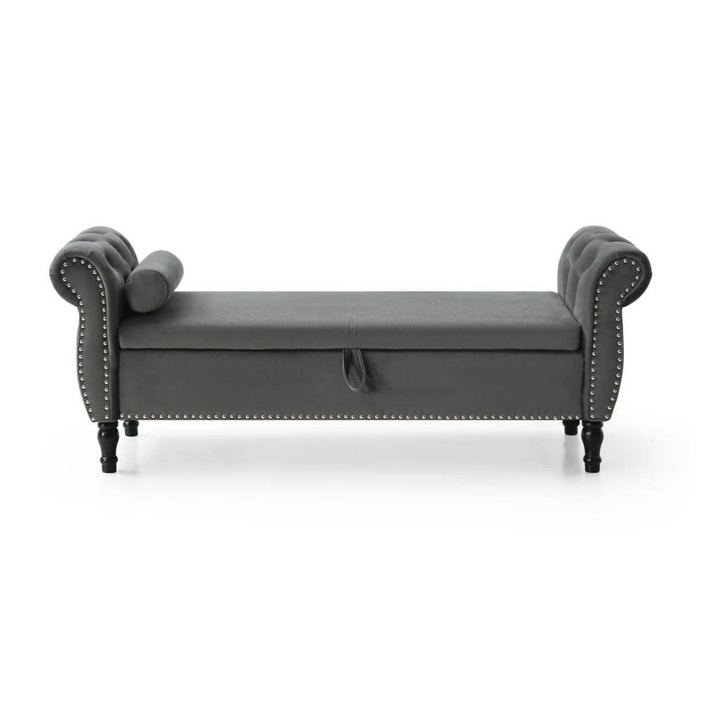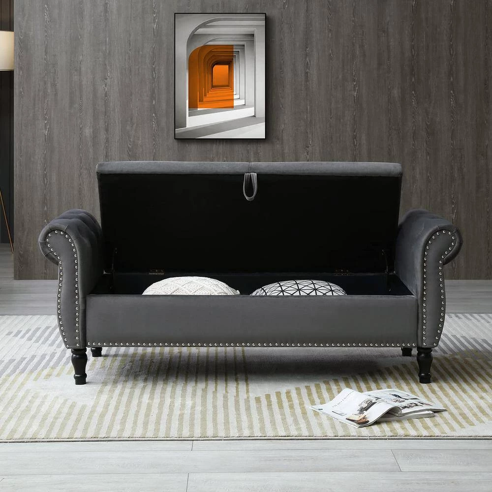 This artful piece and practical bench is an ideal addition to your bedroom/living room/entrance. with rolled up arms, lovely button tufting and nailhead trim, this storage velvet bedside bench not only provides ample storage space, but is also a comfortable bench. Place it by the window or by the fireplace for relaxing time. Use as additional seating, place at the foot of the bed or in entryways and passageway spaces.