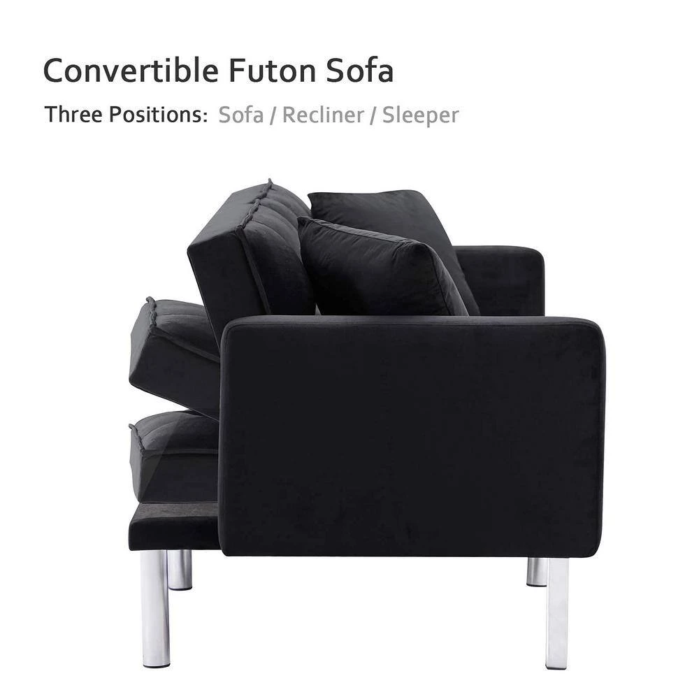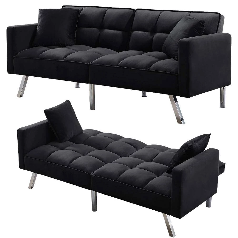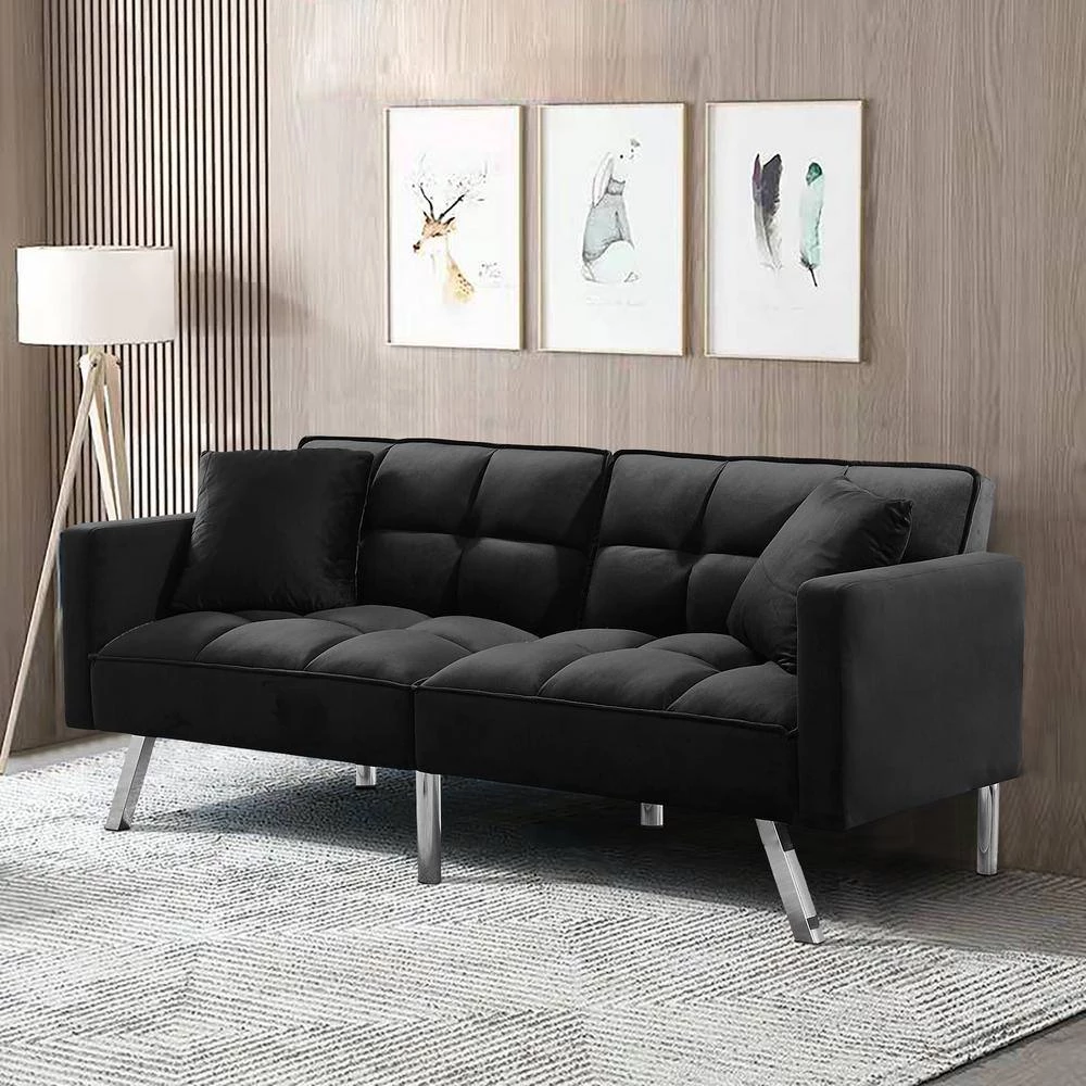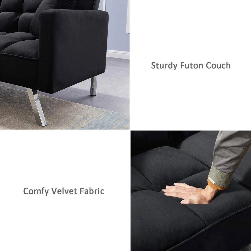 Built on solid legs with silver metal and a fabricated wood frame, this sofa has a clean line profile with a sloping backrest, skinny square arms and metal legs, wrapped in a custom velvet upholstery. The backrest is adjustable in 3 angles to meet various requirements. When you are tired, you can choose the most comfortable angle to read, listen to music, watch movies, and enjoy afternoon tea with family and friends. The sofa converts into a functional futon sleeper in seconds, making it a great choice for your home, office and guest room. Unzip the bottom of the sofa, remove the armrests, legs and hardware, and spend a few minutes assembling the sofa.