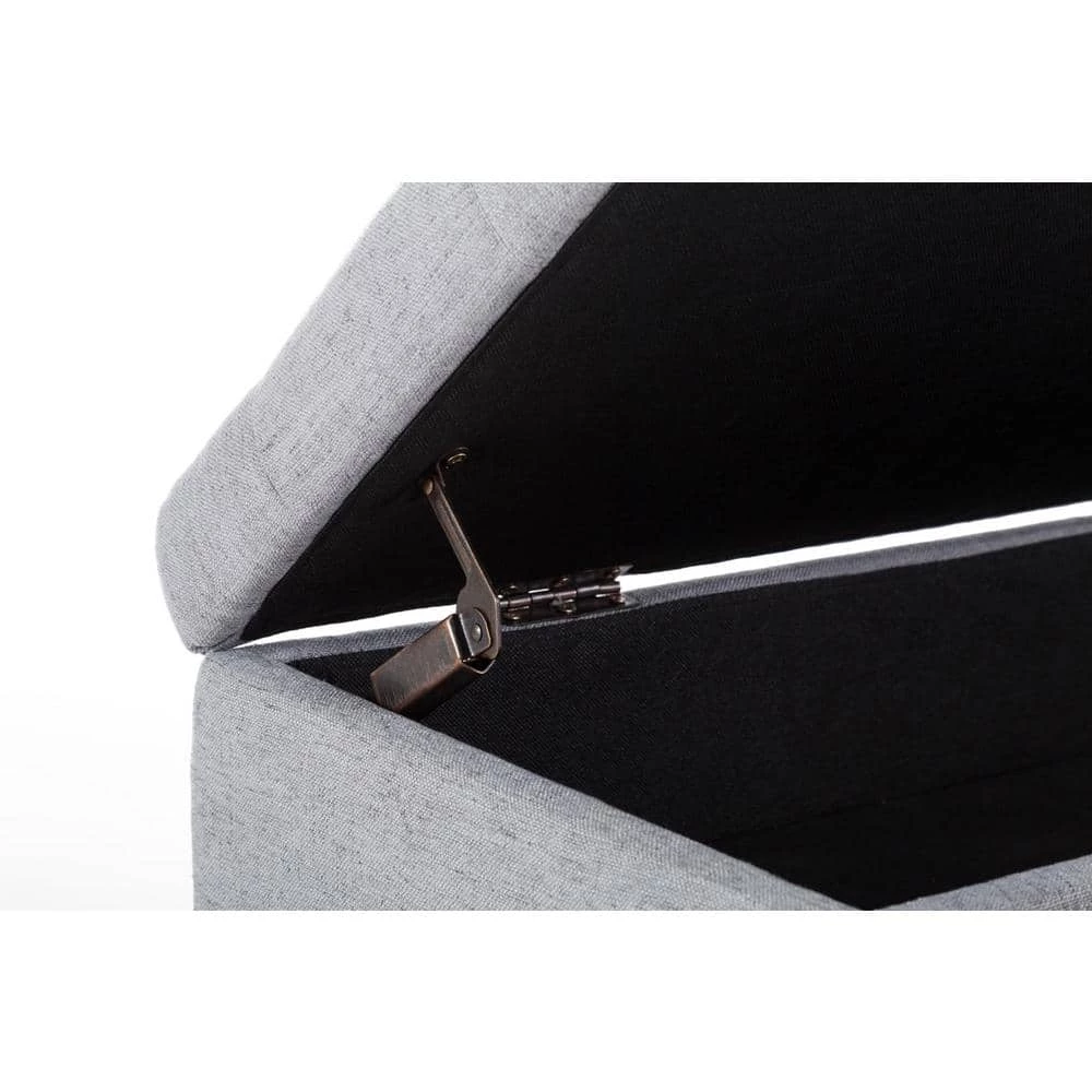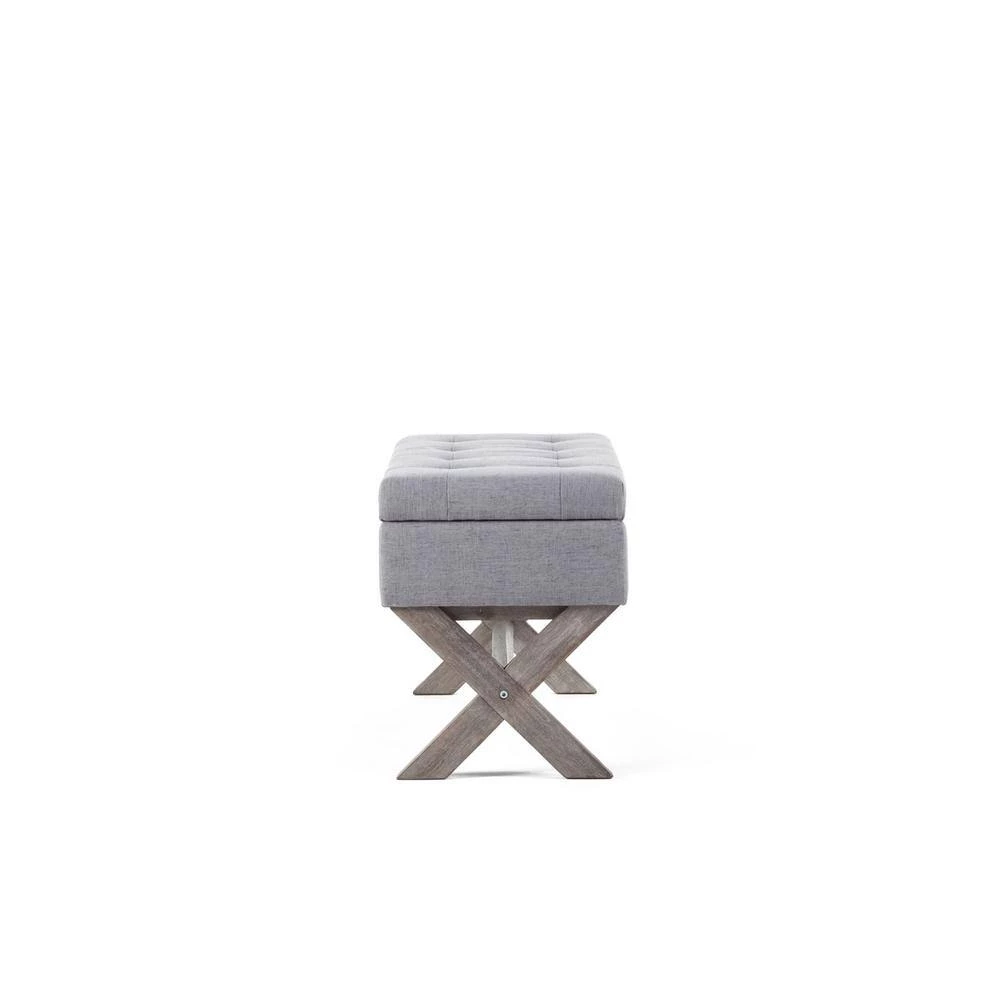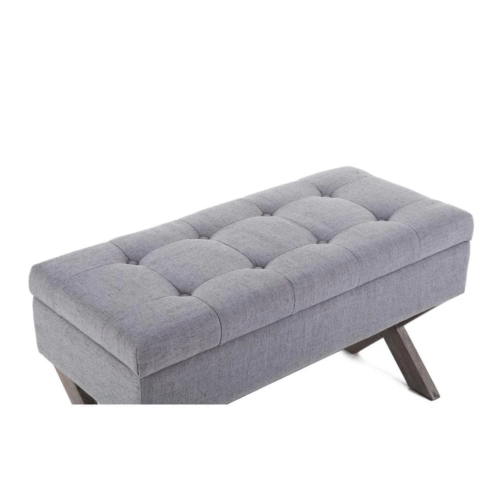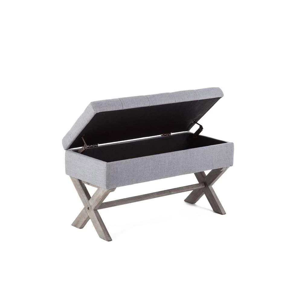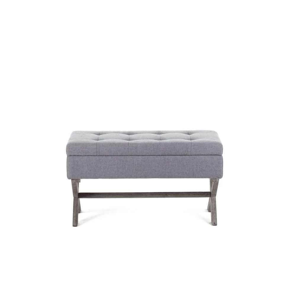 The Angelina Storage Bench is a stylish option for any home. The grey upholstered seat and folding driftwood wire-brushed legs make this an appealing seating/storage piece. The classic design works in a hallway, bedroom or any room of the house.