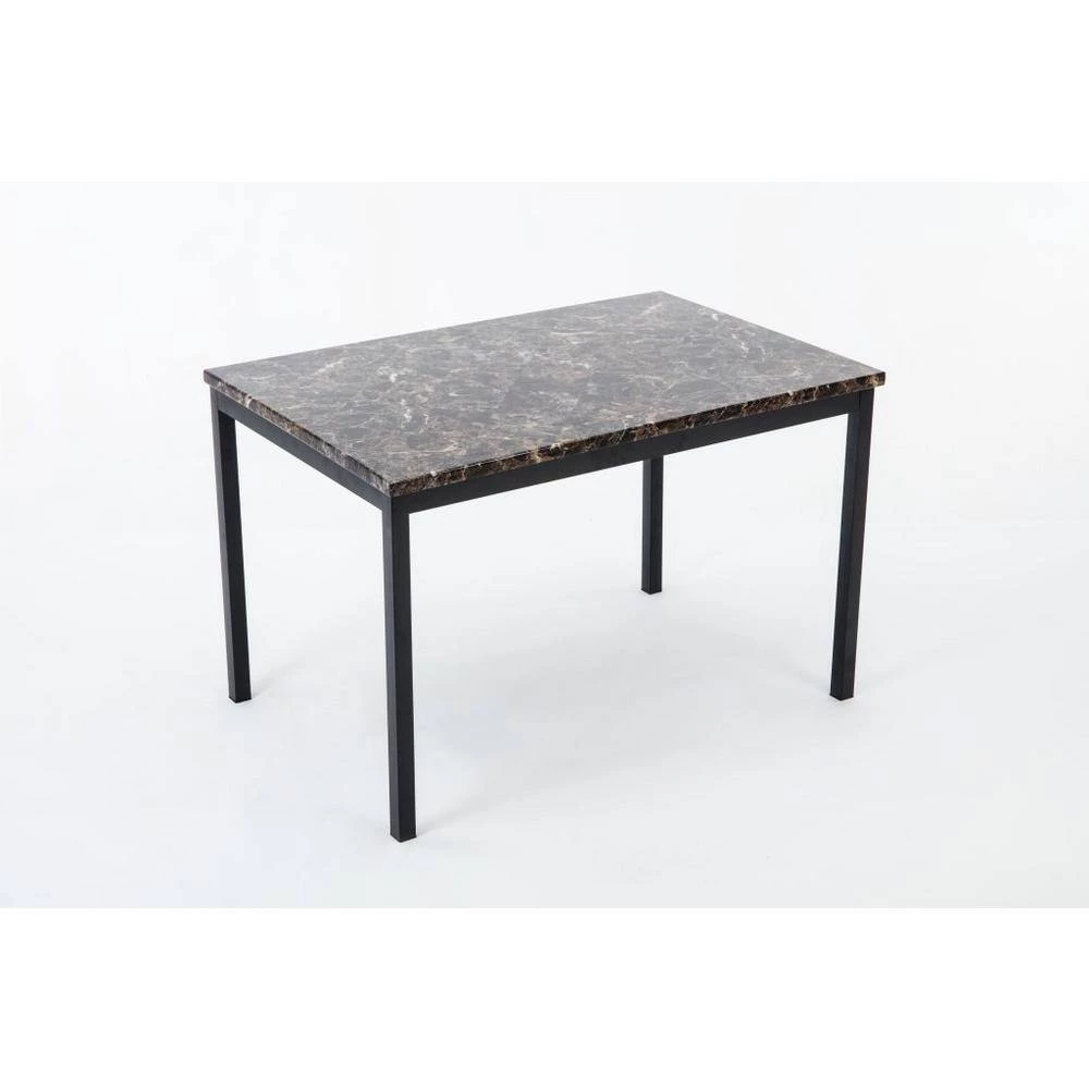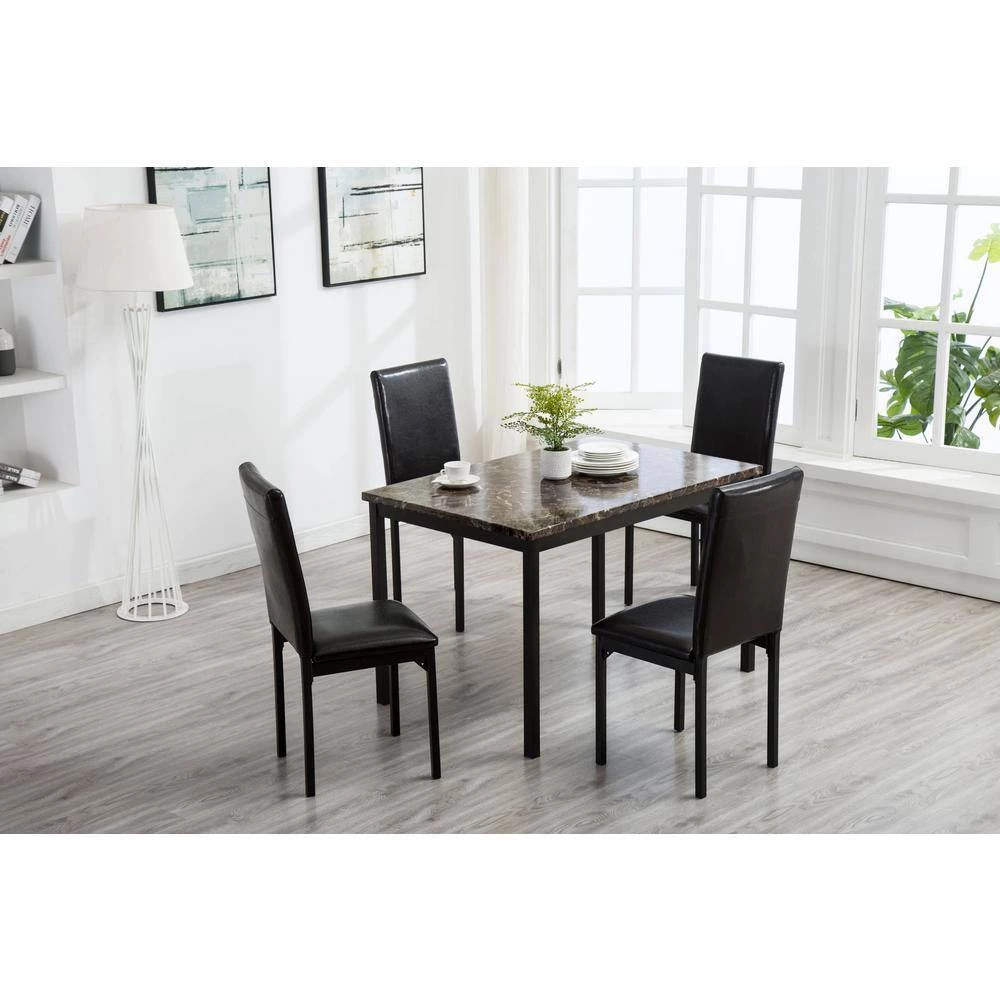 The Arjen 5-Piece Dining Set is brimming with easygoing transitional style. This 5-piece set replicates the look of a much pricier set at an affordable price. The rectangular faux marble dining table comes with 4 faux leather chairs, providing easy seating for 4. The tabletop’s faux marble look is created with MDF covered in durable paper laminate. Choose between the black or the brown leatherette upholstery. and for a counter height dining option, look for the Arjen 5-Piece Counter Height Dining Set (sold separately).