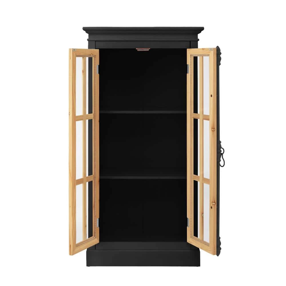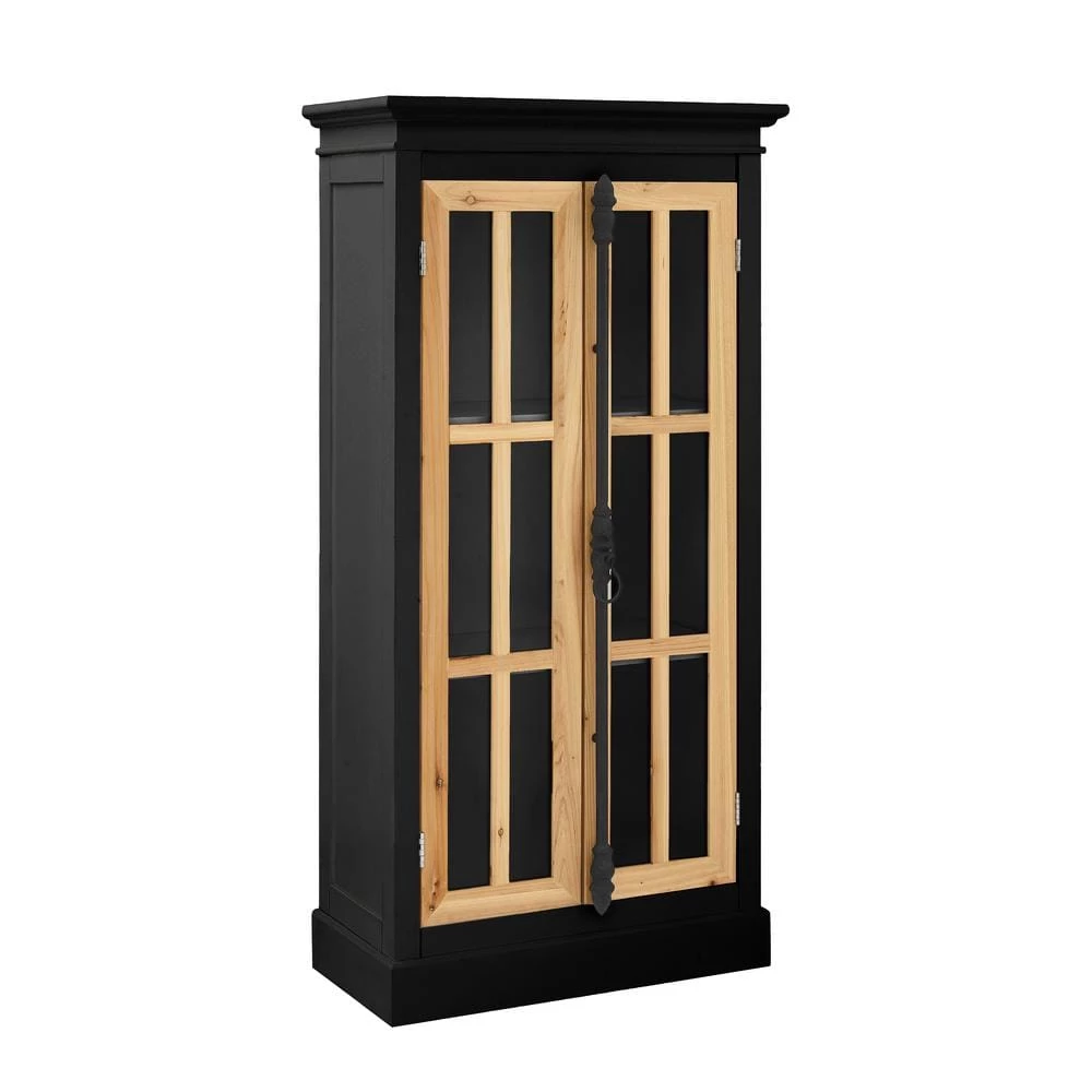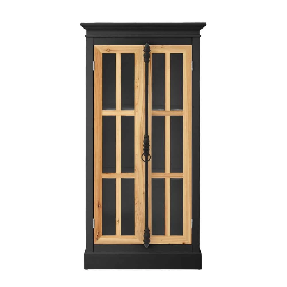 Beautiful black industrial damper handles and natural wood front doors create a striking contrast with your choice of white or black main cabinet paint finishes. Cabinet doors are secured using magnetic hardware door closers. The contemporary tempered glass doors add a touch of designer detail to this display case, with plenty of room to display your favorite china or collection.