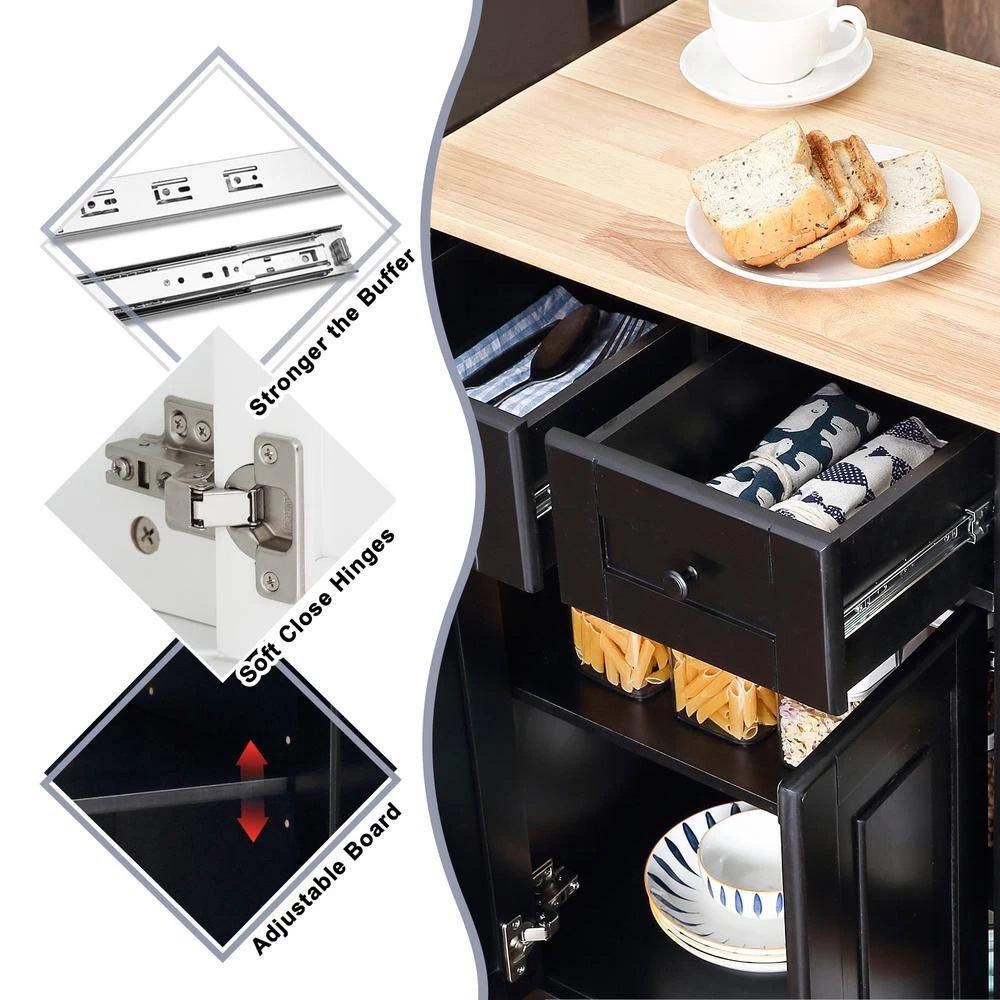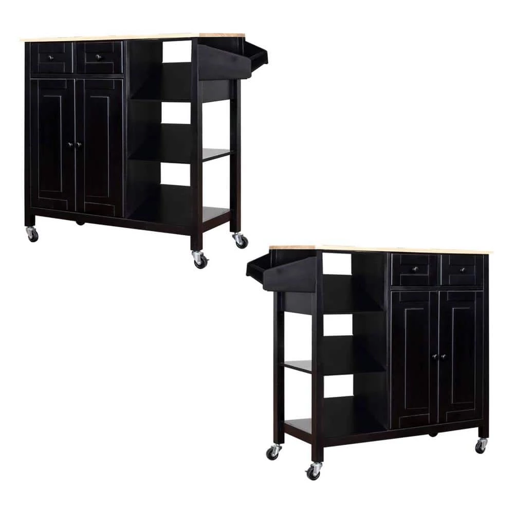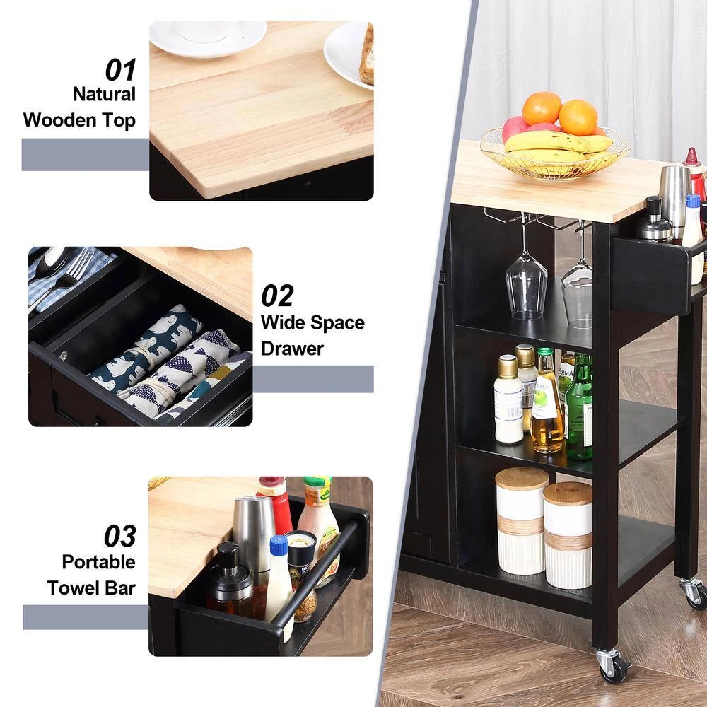 - Functional kitchen storage: the wide wood top can be used as a cutting board or stand to place a microwave oven, roaster. the mobile kitchen island is designed with 2-pull-out drawers, 2-doors, 3-open shelves and cabinet to store utensils and wine glass holder. a spice rack and a tower bar keep small bottles and kitchen towels on hand