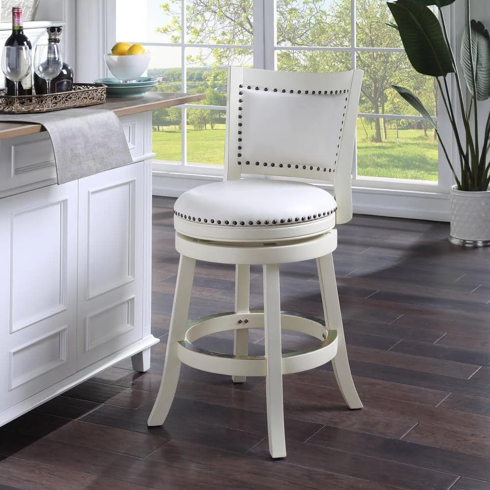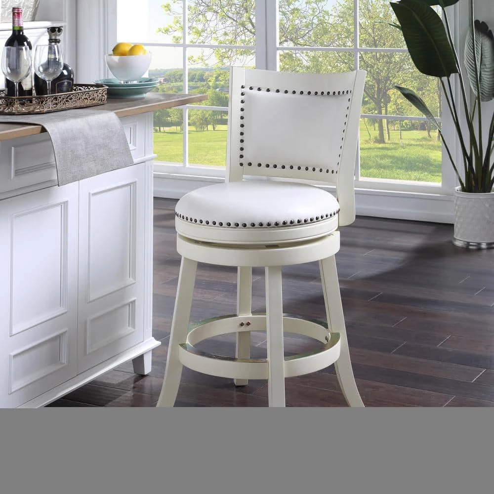 Use the Boraam Bristol Bar Stool to enhance any seating area. This stool features a modern style for an updated look that will complement your home. It has a swivel design, which ensures that you can easily get in and out without needing to pull the stool out. It features a full back, providing you with a lot of support, so you can sit comfortably for an extended period of time. This stool features a wooden frame, making it easy to maintain and creating a homey, aesthetically appealing look. It features a faux leather seat, which provides a touch of style. This white stool beautifully contrasts with darker interiors for a monochromatic room decor. It features a foot rest, ensuring a more ergonomic design and promoting better posture. It has a nailhead trim, accenting the stool with some metallic contrast for a sophisticated design.