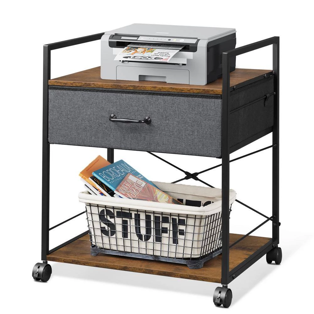 The printer cart is built with a double tier design and a drawer, keeps printer or scanner within easy reach of your desk to free up workspace and also can be used as a file cabinet, side end table, nightstand, storage shelf, kitchen trolley cart and so on. The mobile filling cabinet made of MDF board is water resistant and anti scratch, very easy to clean. Heavy duty steel frame with wooden desktop and fabric drawer ensures stability and durability, each shelves can bear up to 66lbs.
