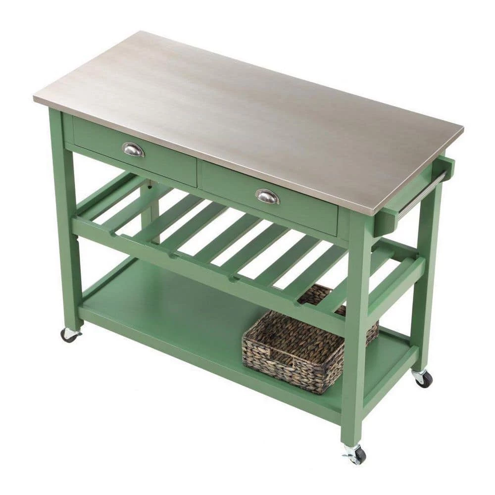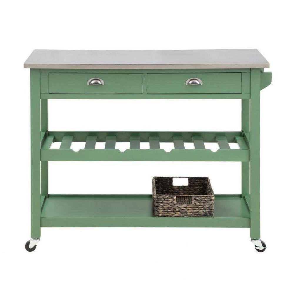 Part kitchen island, part bar cart, the Carolina Kitchen Island is perfect storage addition for your space. An adjustable wine rack holds up to 4 bottles of your favorite vintage, while the 2 drawers can store corkscrews, aerators, coasters, and other drinkware accessories. Transport dishes or desserts from the kitchen to the living room using the wide lower shelf. Your kitchen cart also includes the convenient storage basket, made from woven water hyacinth. Measuring 14.17 x 11 x 4.33 in., the basket can store plates, silverware, dish towels, and other kitchen necessities. Look to the other items in the Carolina Collection, like the 6-Piece Carolina Dining Set, to complete your home in charming cottage style.