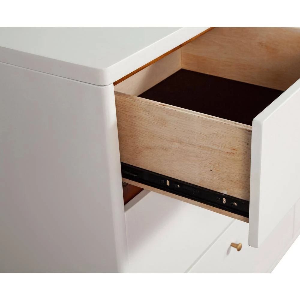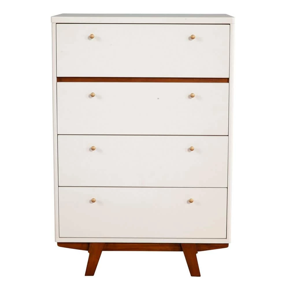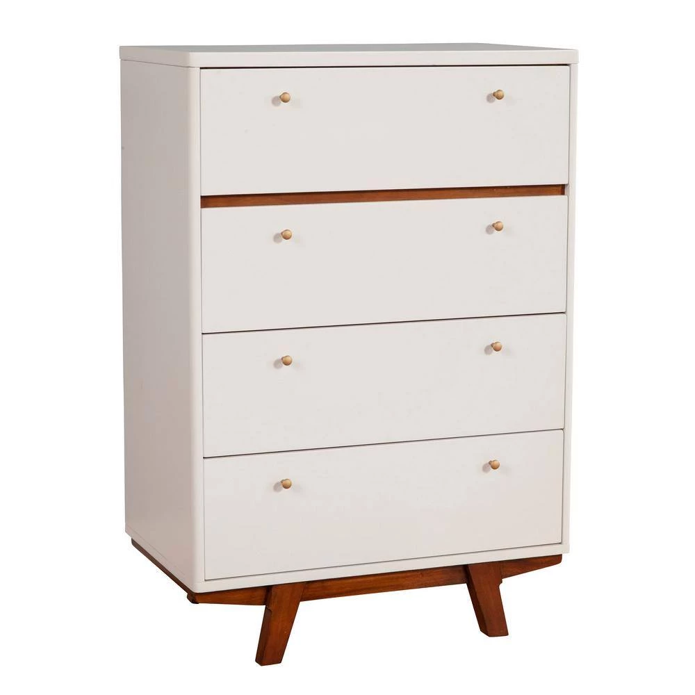 Give your bedroom a stylish and modern, mid-century feel with this clean lined collection. The Dakota 4 drawer chest is structurally sound and constructed with Mahogany wood solids & veneer in a white finish and trendy acorn brown accents. The Dakota collection hints at subtle refinement, without overpowering your current decor. Drawers feature English Dovetail Drawer Construction, felt lined top drawer to protect your valuables as well as metal ball bearing drawer glides The pieces in the Alpine Furniture Dakota collection fluidly fits in with a variety of aesthetics and color schemes to compliment your bedroom setting. Coordinate with other pieces from the Dakota bedroom collection.