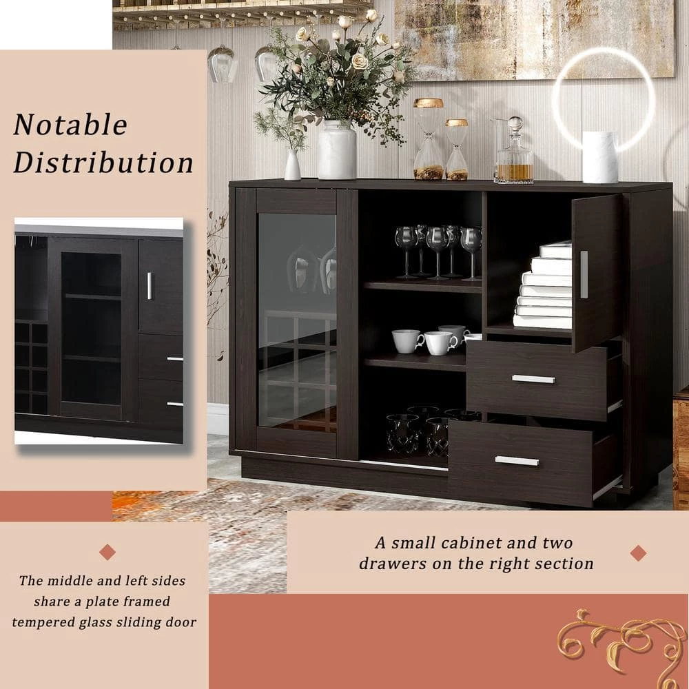 - Left section of this cabinet is designed to accommodate alcohol products, especially wine, in that case, there are 2 wineglass holders beneath the tabletop, and a integrated 16 bar wine compartment to accommodate various wine bottles, the wine compartment holds wine with a maximum diameter of 3.4 in. a wineglass holder can hold 3 glasses, the wineglasses holders and the integrated 16 bar wine compartment could be removed if users don’t need them