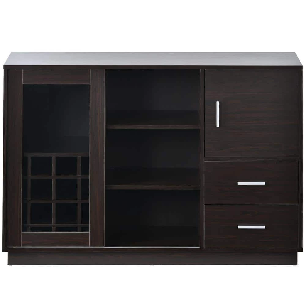 This is an idea furniture for most wine lover since there is a dedicated space were used to store alcohol products, and this dedicated space is designed on the left side of this cabinet. The middle and left sides of this cabinet share a plate framed tempered glass sliding door, that’s practical and convenient. The right side of this cabinet is made up of a small cabinet and 2-drawers. The main material of this cabinet is high-quality particle board, and match with metal accessories. The stickers are used on the surface of these particle boards to ensure a smooth appearance, and there are 2 different color options are introduced to market, white and espresso. The handles and wineglass holders are made of treated metal, and that can guarantee the wonderful using experience.