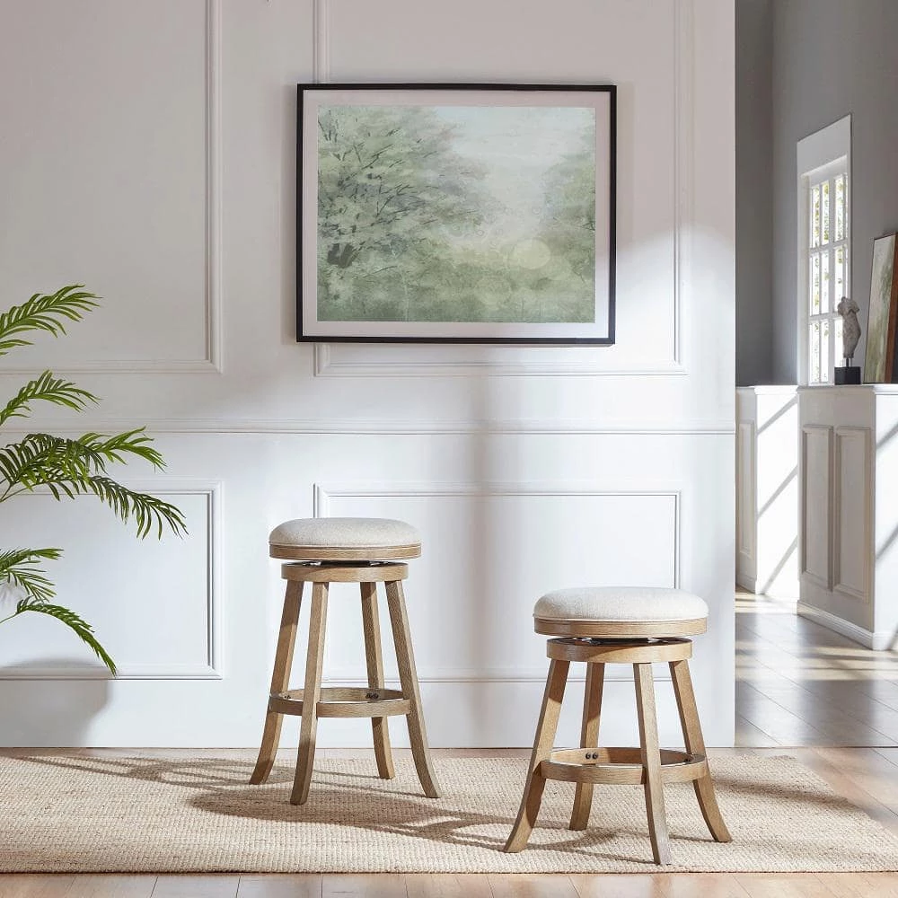 The backless Fenton Counter stool can be tucked away or put on display, either way it’s a stylish yet wise investment. A one-of-a-kind stool designed for the elite, the Fenton sits in a class of its own. Together, the handsome multi step wire-brush finish and linen upholstered seat combine with superior engineering to construct a stool where fashion, quality and practicality all meet. The Fenton features a full-ring footrest protected with a metal kick plate on top, double seat apron, high density foam cushion and a ball bearing steel swivel plate which provides a flawless three hundred and sixty degree swivel. Also available in 29 inch, bar height.