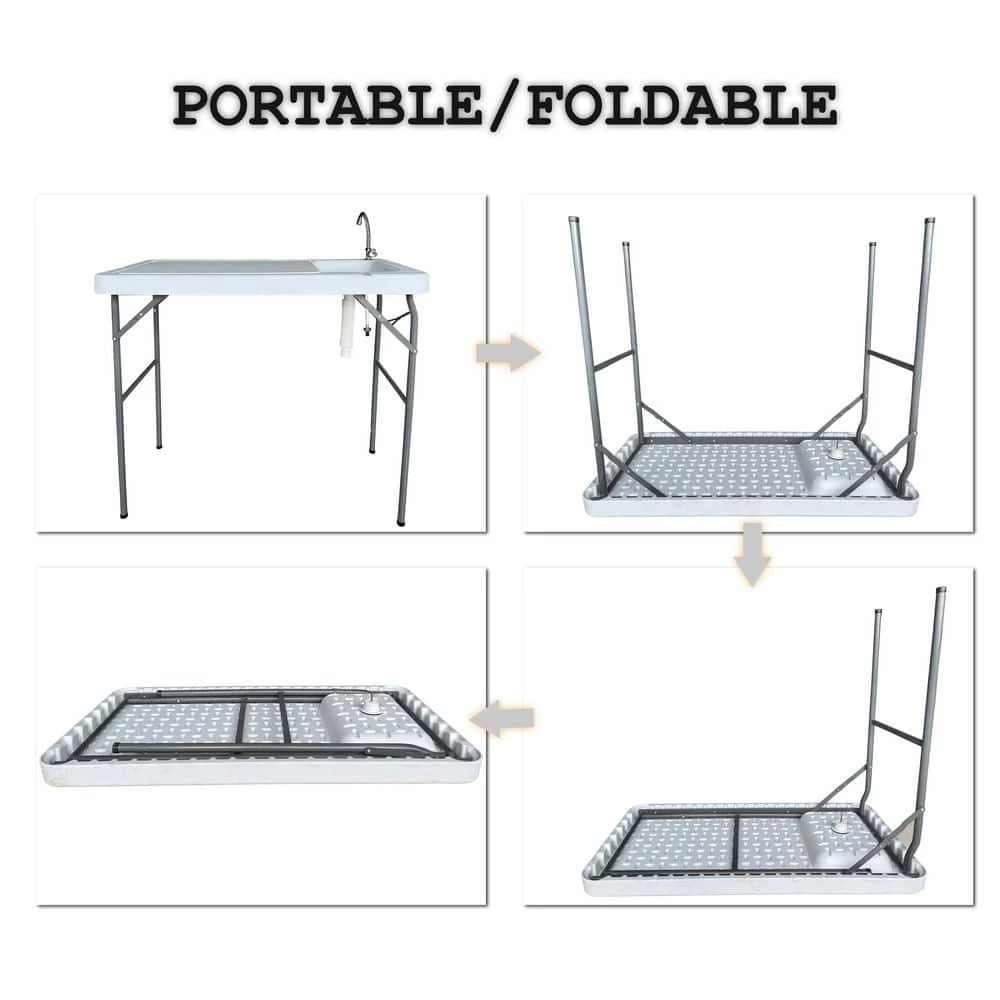 - Foldable cleaning table with detachable faucet and drain; combines sink for washing and work surface on which you can process fish, cut vegetables and fruits