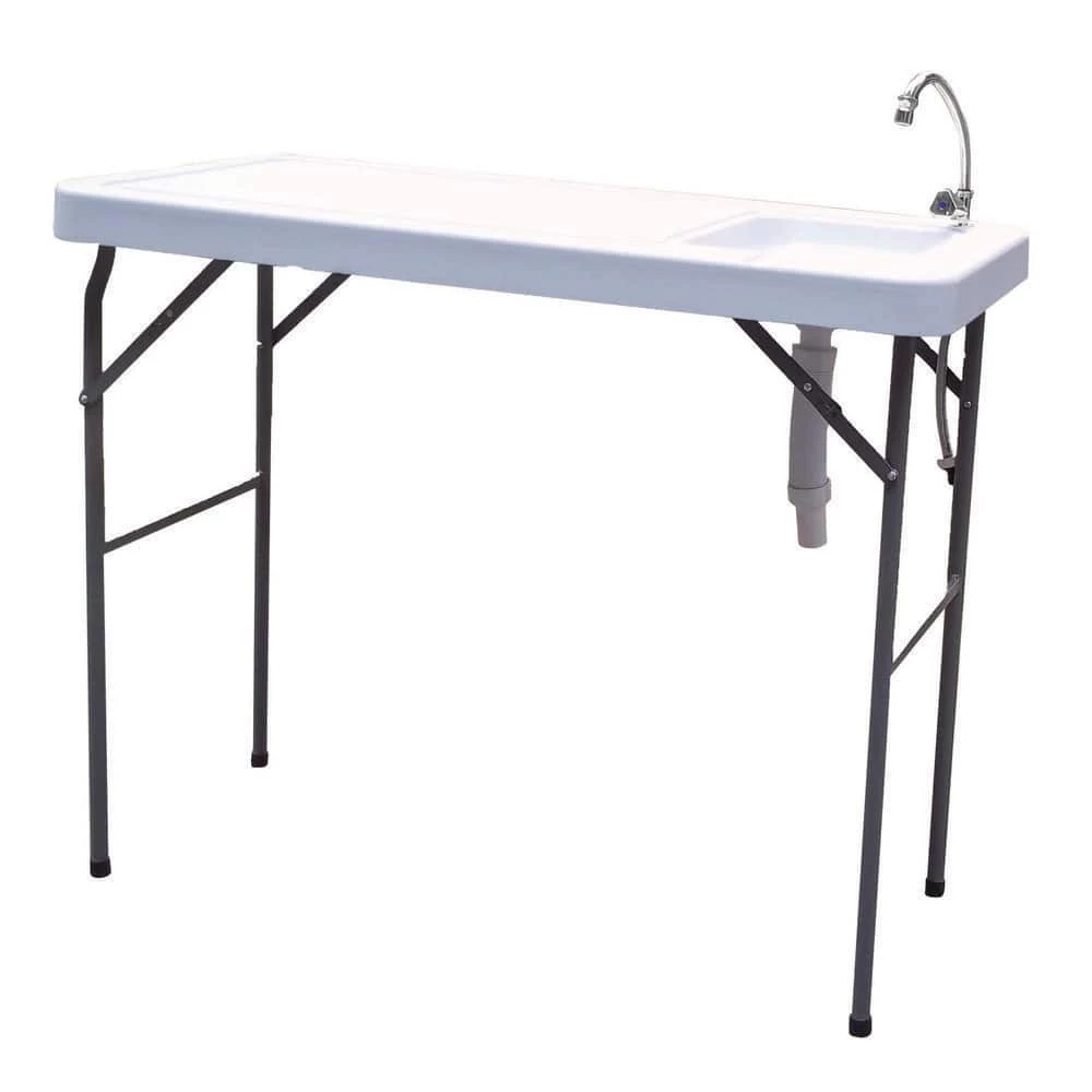 This multi-functional utility table is extremely sturdy and durable. With the molded-in sink, this unit is great for all kinds of chores. Simply hook up to the kitchen or garden hose, and you are ready to go Easy to set up and move. Legs lock in both the folded and upright positions. This table is also perfect for tailgating or backyard parties. The stainless steel faucet features a flexible sprayer that hooks up to a standard garden hose to provide fresh water. A containment groove in the table channels liquids into the sink, and the flexible drain hose lets you empty the sink into a bucket or floor drain to minimize cleanup.