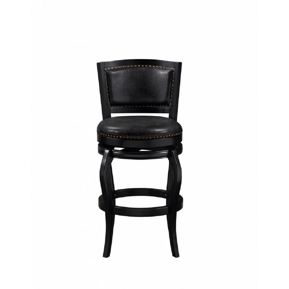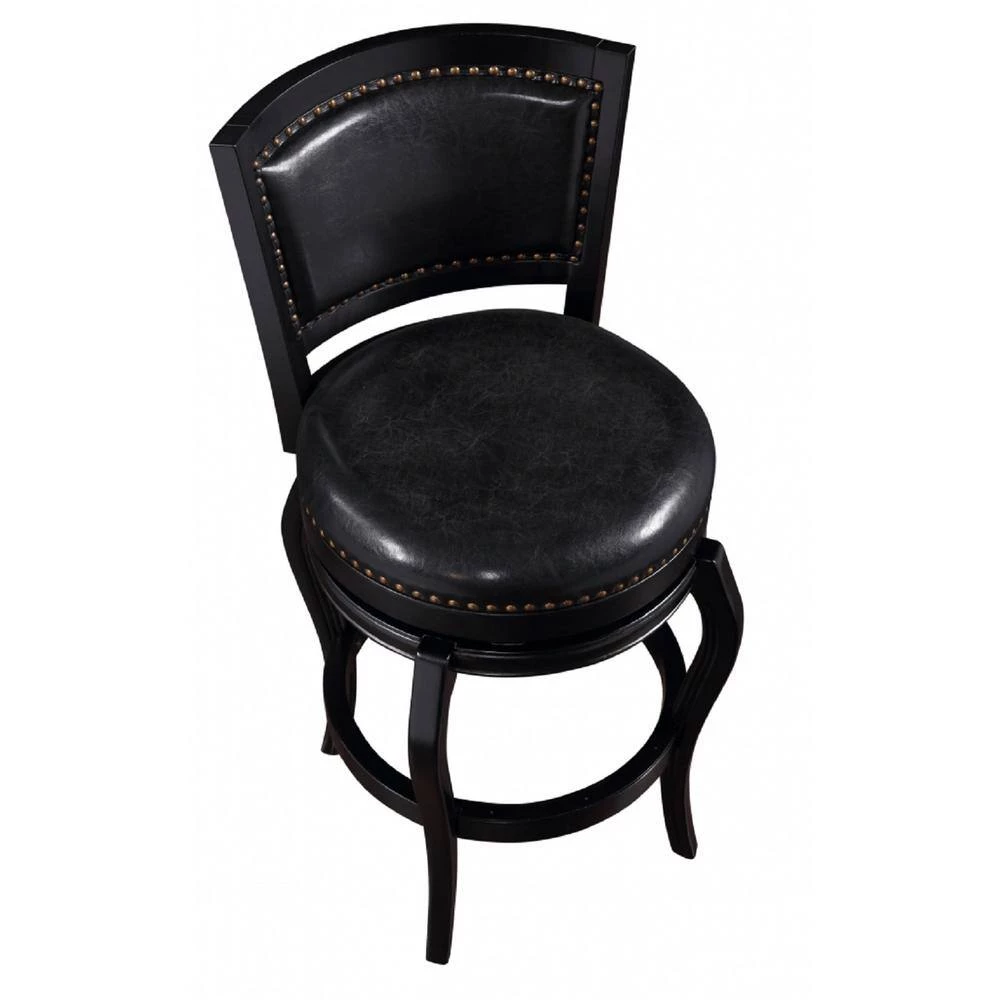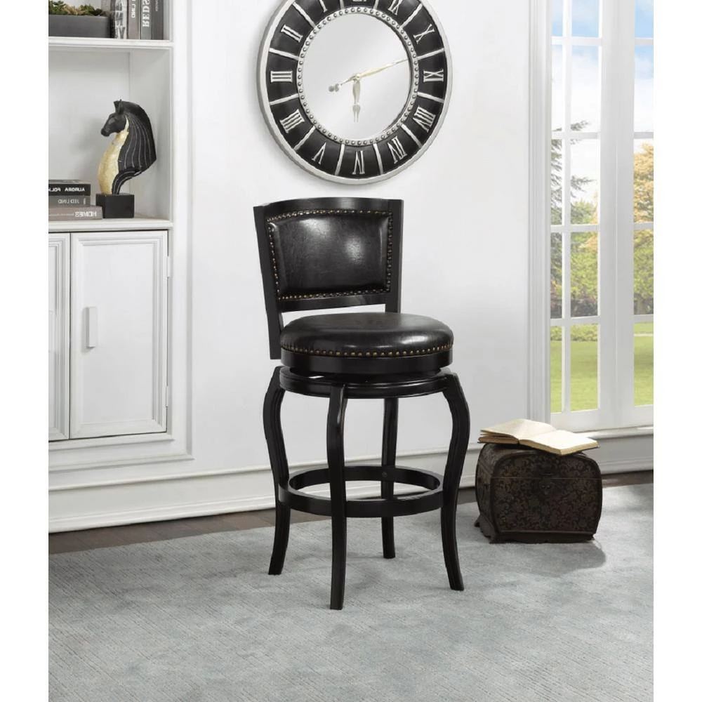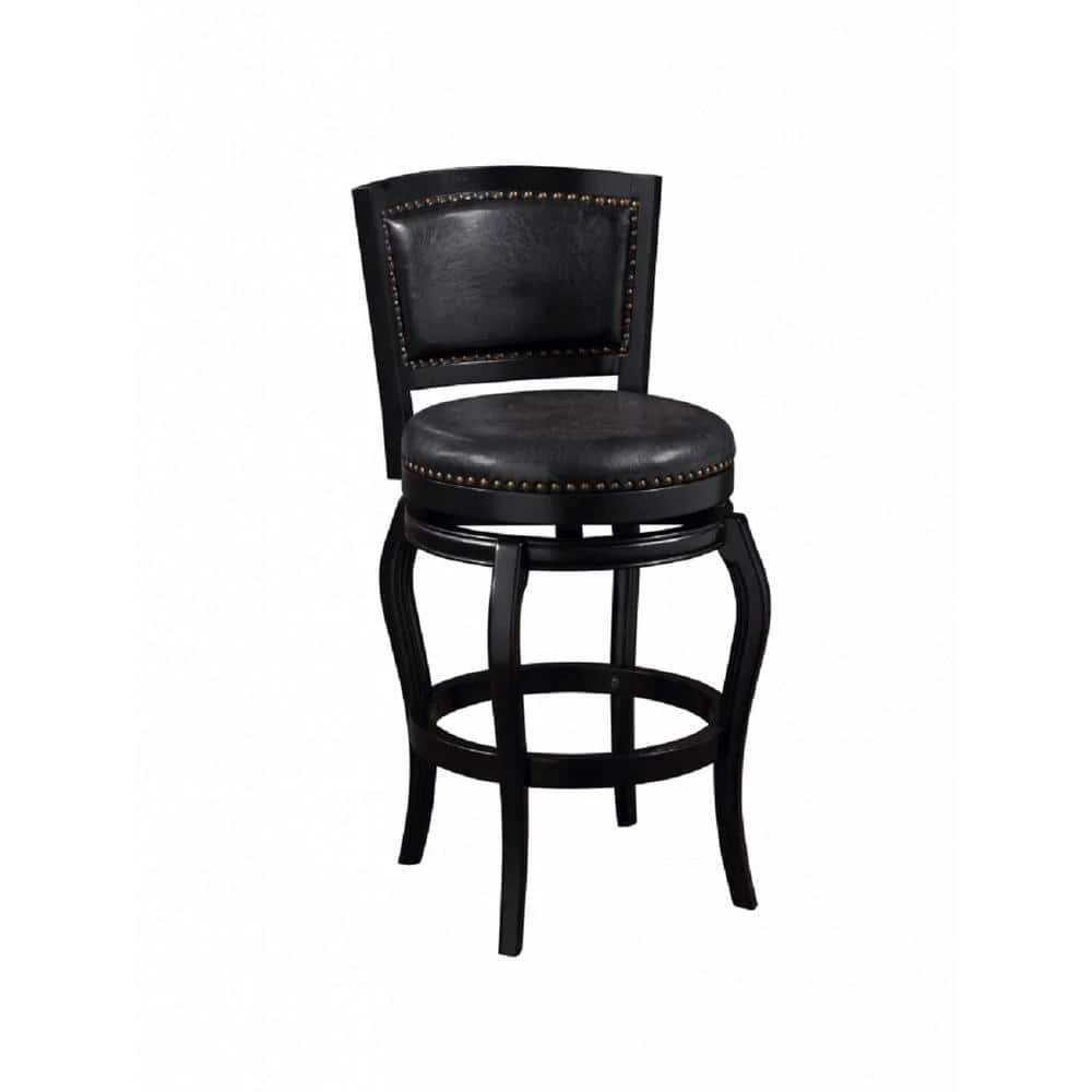 The Harris Memory Swivel Stool knows you take your comfort seriously. That’s why it features an oversized seat (22 in. Dia.) with padded high-density foam cushioning in the seat and backrest. The stool’s versatile 180° swivel is enhanced by a steel memory return-swivel mechanism, bringing your stool to its original position after removing static weight. For additional support and comfort, the footrest is built from a solid piece of hardwood with a protective metal kickplate that guards against scuffs and scratches. Genuine brass nailheads provide a traditional accent to the black faux leather upholstery. The Harris is available in three different finishes: Cappuccino, Black, and Cherry. Make this a 3-piece set by pairing two barstools with Boraam’s Florence pub table in a matching color. This stool is recommended for residential use only.