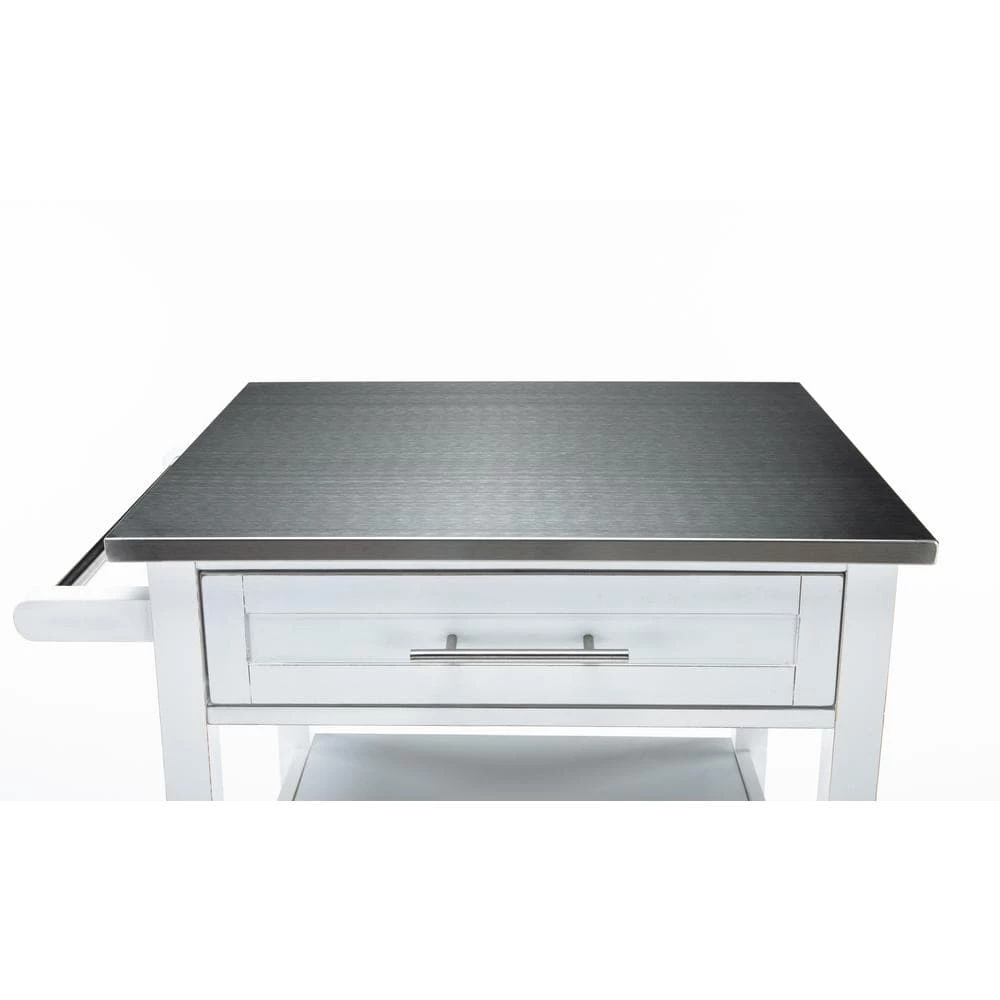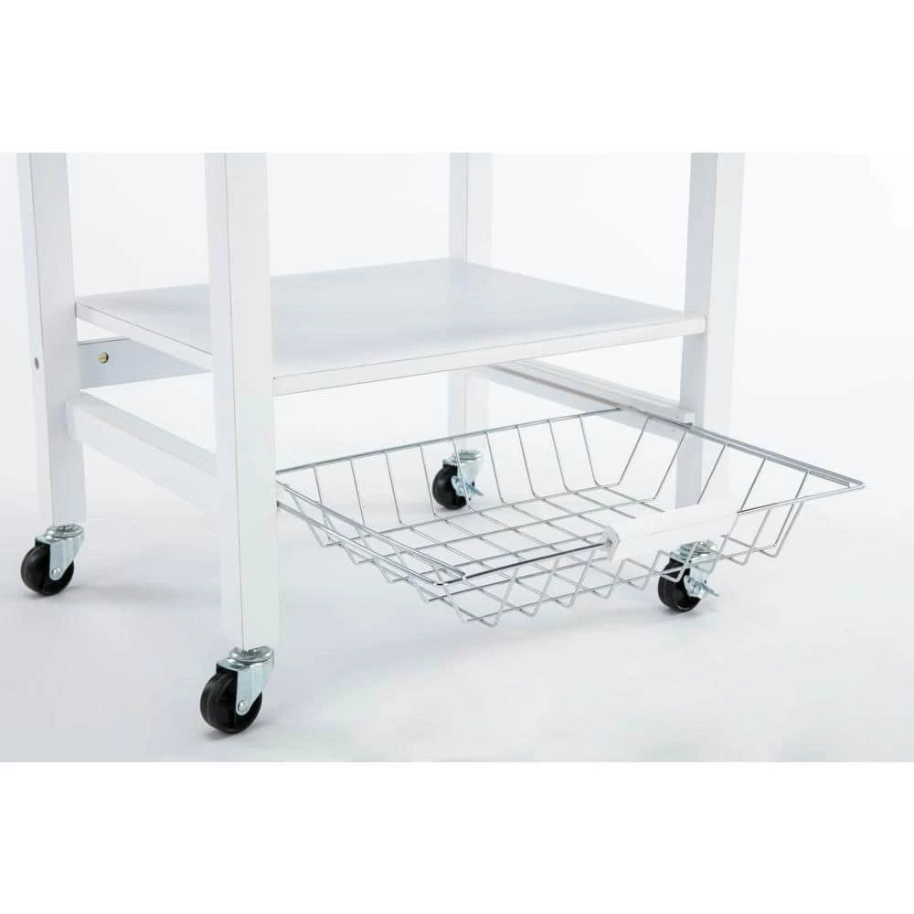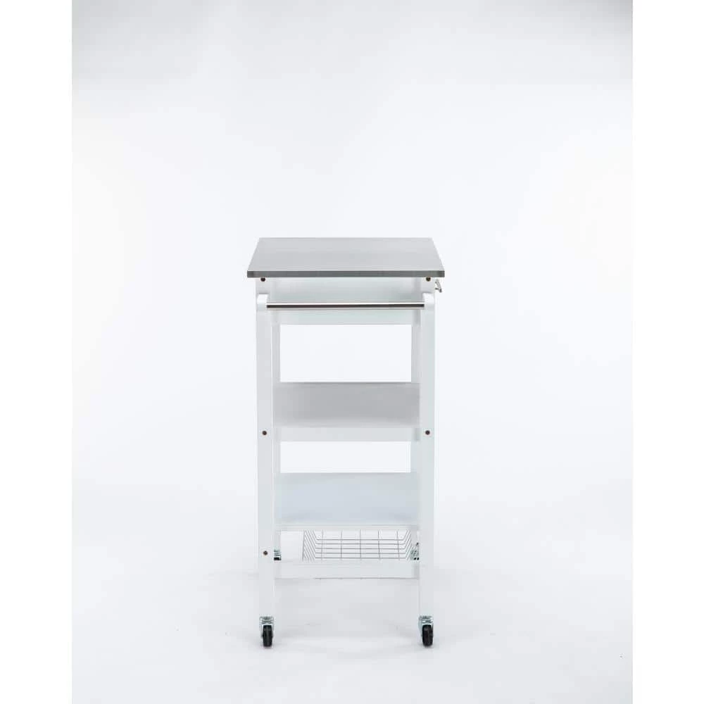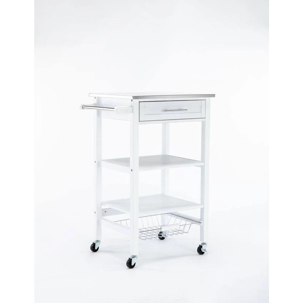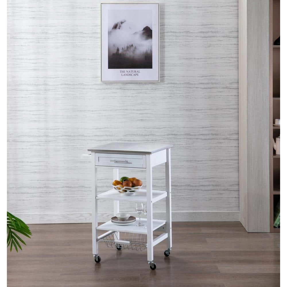 This kitchen cart is constructed with a pine wood frame, MDF shelves, and a stainless steel top. It will be available in a white wash finish. This item has a drawer, shelf space, and a metal wire basket for storage. Four locking casters for mobility. Towel rack is getting changed to a metal rod. Ready to assemble upon delivery.