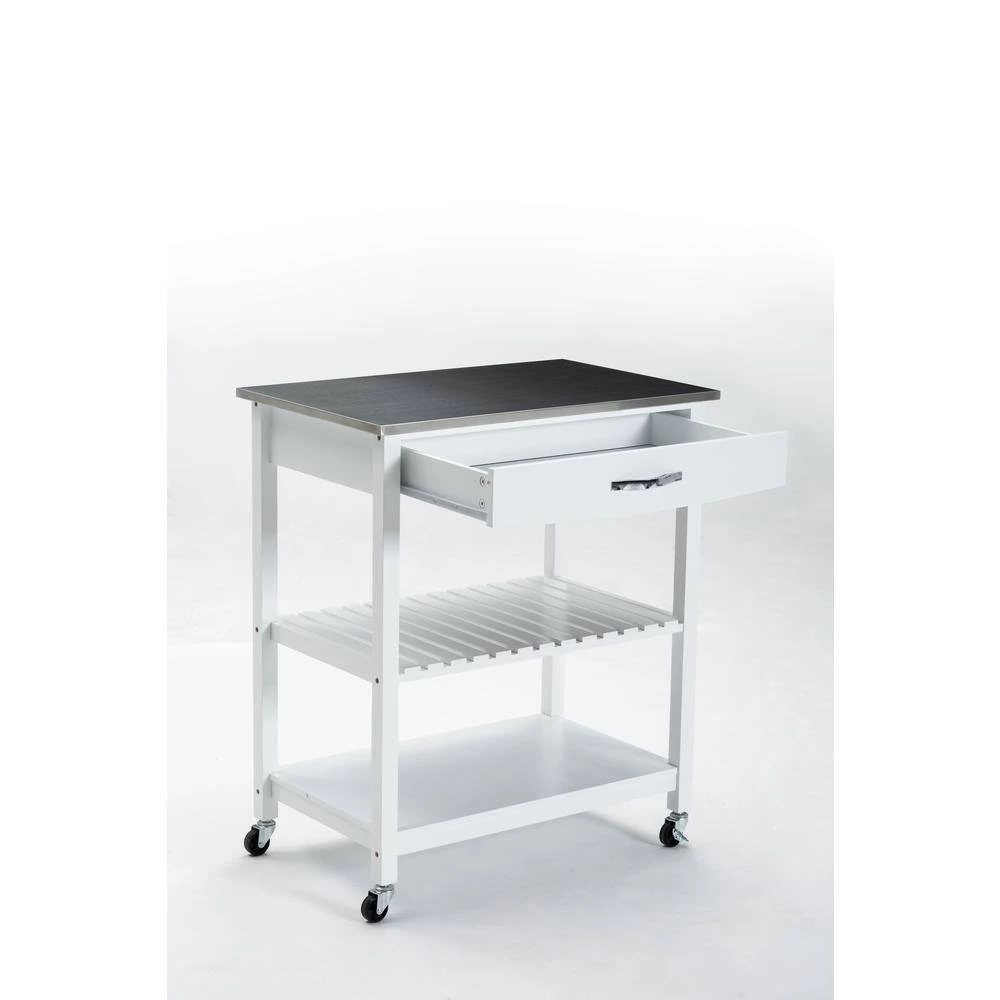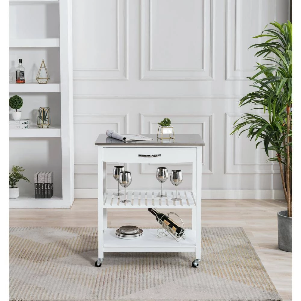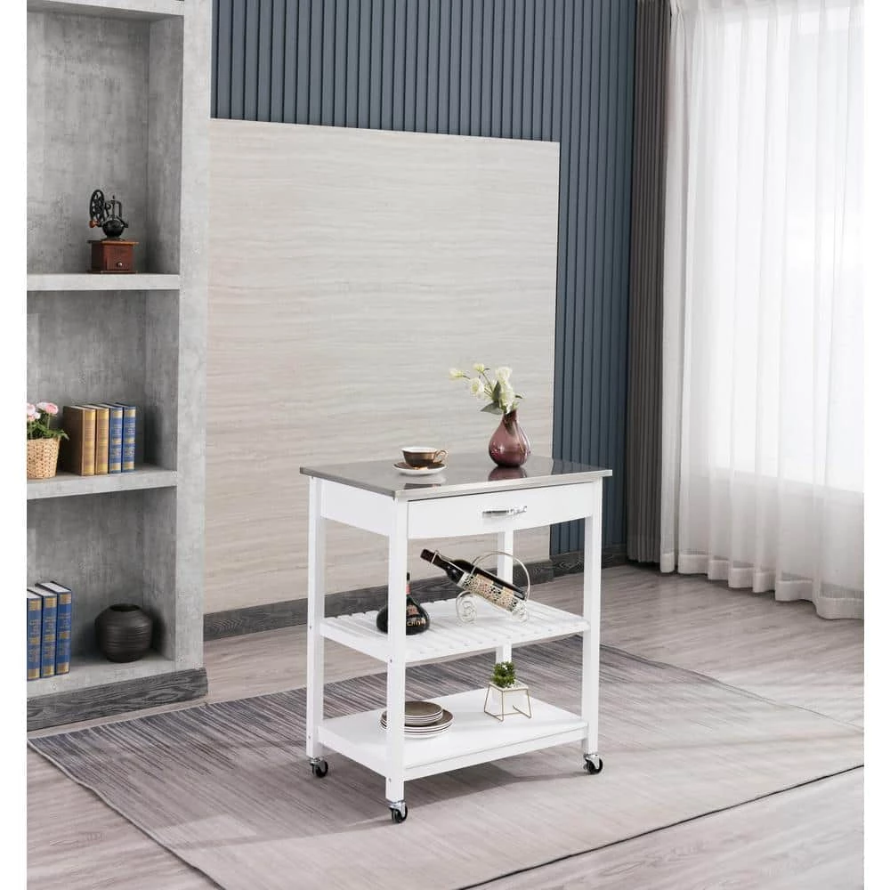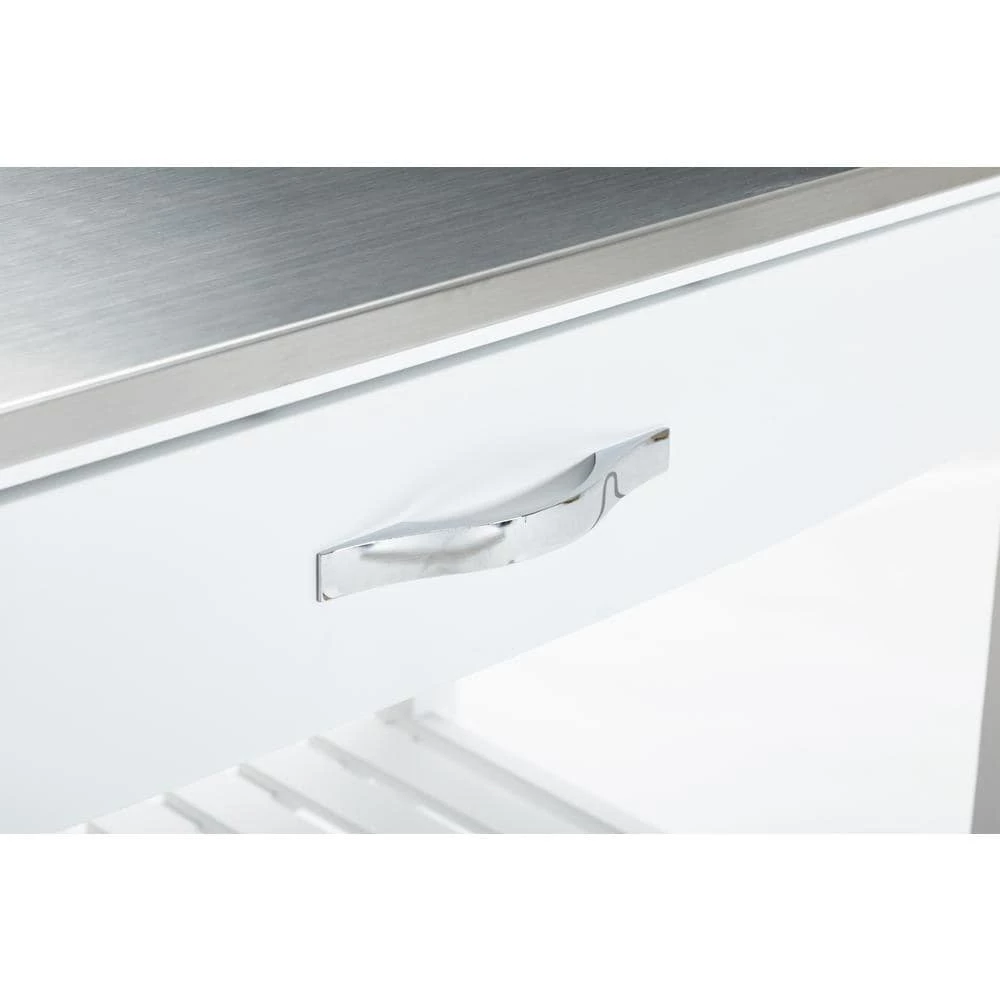 If you need a little extra storage and prep space for your kitchen, look no further than the Holland Kitchen Cart With Stainless Steel Top. This rolling kitchen cart also makes a great bar cart! Store dishes, glassware, cutlery, or your favorite spirits on the lower shelves. A slender drawer conveniently holds napkins, utensils, corkscrews, and other kitchen must-haves. Use the rolling caster wheels to roll this cart from the kitchen to the living room whenever guests are over, then wheel it back when it’s time to wash the dishes. It’s built from pine wood and medium density fiberboard with a stainless steel work surface. Available in three finishes; Gray, Navy Blue, & White. Ready for assembly upon delivery.