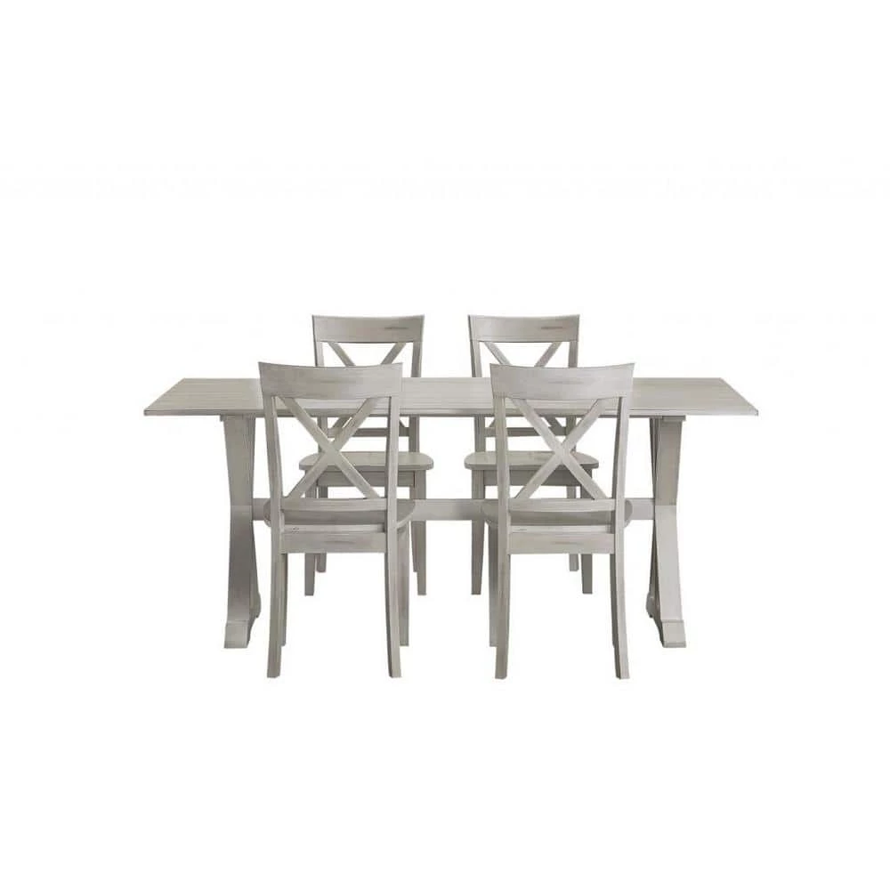 Somehow, food tastes a little better when it’s eaten around the Jamestown Dining Set. Maybe it’s the set’s farmhouse-inspired look and feel. The rustic antique white finish, the X back chairs and the trestle-style base are all perfect examples of cottage style. All pieces are made from a combination of medium density fiberboard and solid wood. Customize the Jamestown Dining Set to your needs: turn it into a 5-piece, 6-piece or 7-piece set with any combination of our Jamestown Dining Chairs and Benches around the table.