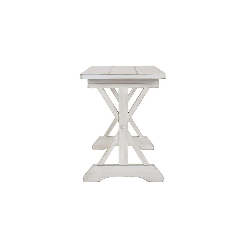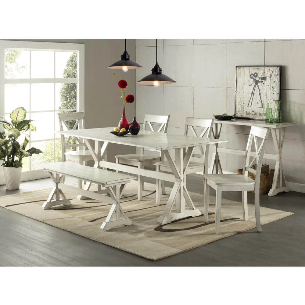 The Boraam Jamestown Dining Bench is dripping with quaint farmhouse charm. This plank-style bench and its trestle base are constructed from a combination of solid wood and medium density fiberboard. Everything is then coated in a antique white finish, which adds a charming vintage effect. Easy assembly is required – tools and hardware come included. Be sure to pair this bench with the matching Jamestown Dining Table and Dining Chairs from Boraam.