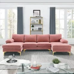 110.63 in.W Modern Pink U-shaped Chenille Sofa With Gold Metal Legs by Unbranded