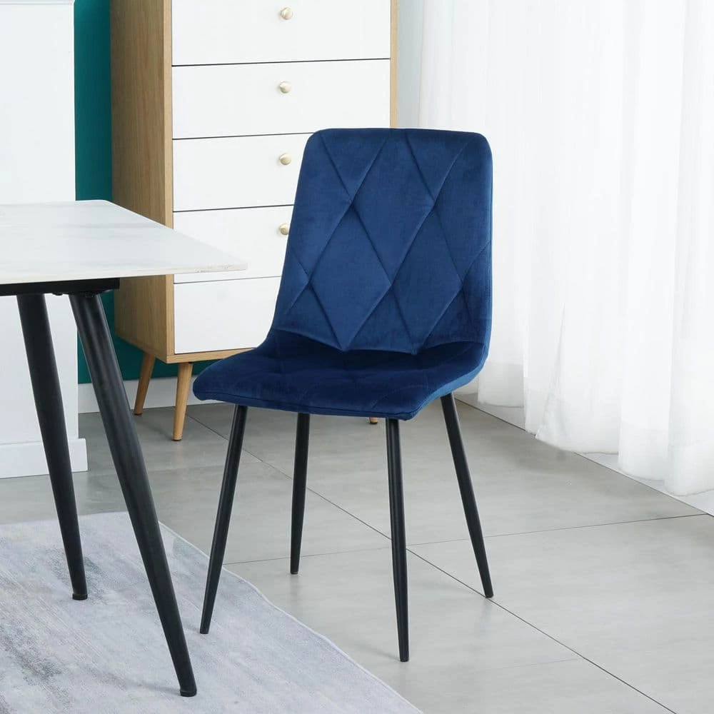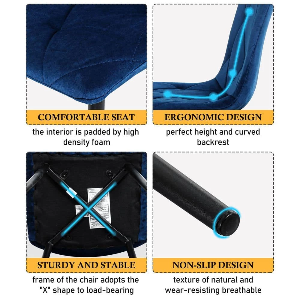 Modern design four-piece dining chair with classic velvet back plus black powder-coated legs, each chair can hold up to 250 lbs., you can use it with confidence. The foam-covered seat plate has a graceful curve that conforms to your body for extra comfort. four legs with a whole back,make the chair looks very simple and elegant, even simple but can give your good support.Only 4 holes for using the screws to connect the back and legs, very easy to assemble the chair even for a lady.