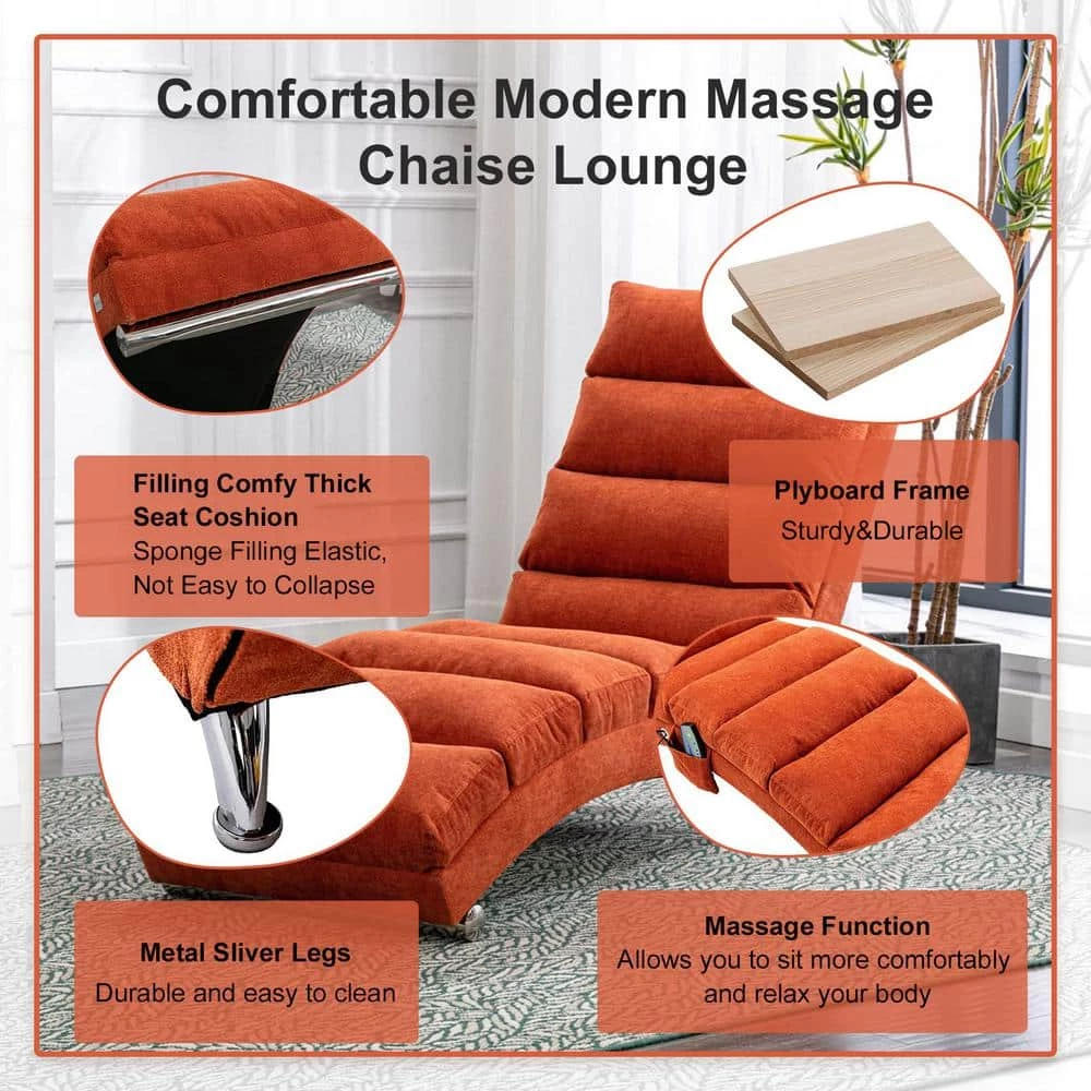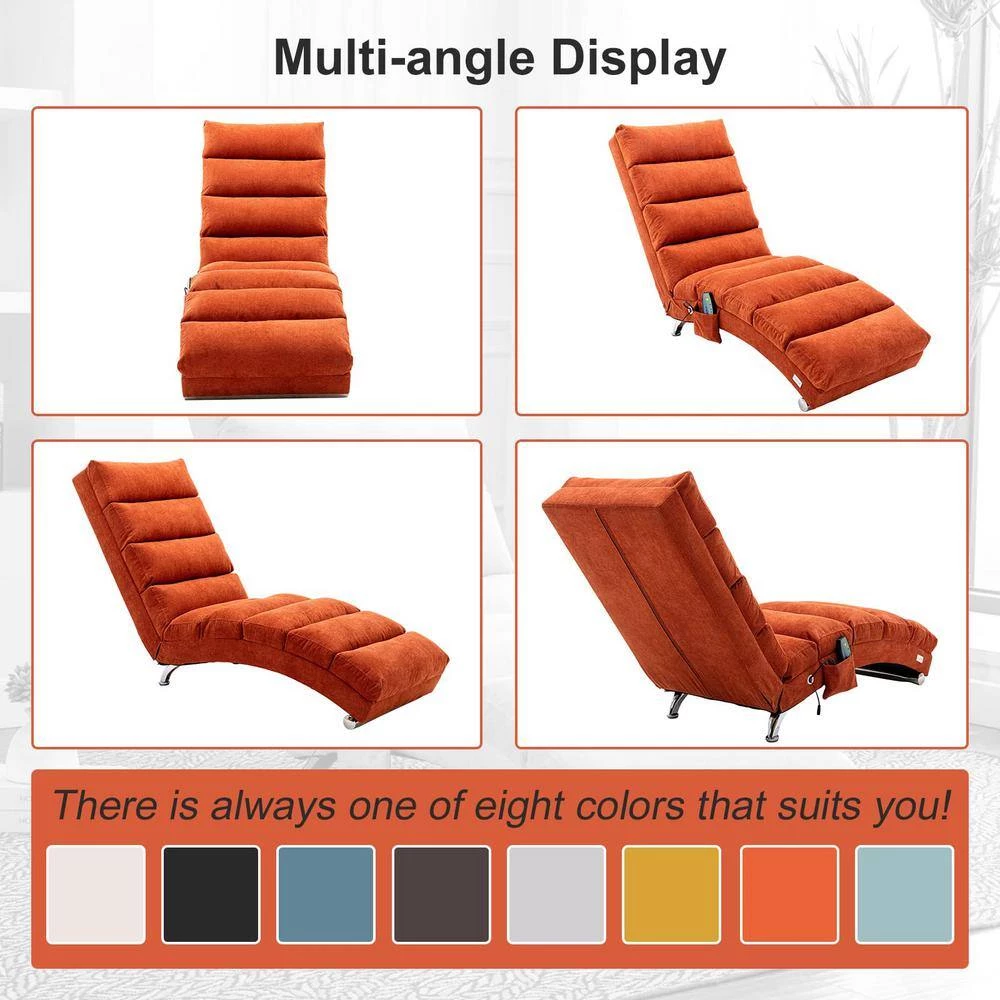 This Massage Recliner Chaise Chair is very easy to assemble. All accessories are included in the package, you can finish assembling in less than 10 minutes. with a side pocket to store the remote control in place. Heavy Duty Wood Frame stable steel legs contribute to the stability of the construction, so that the massage chair supports up to 300 lb.With this chaise lounge, you can enjoy massage anytime and anywhere at home.You can freely choose the intensity and location of massage, the ergonomic design which providing a complete body relaxation, make you feel the comfort of first-class. The massage function will relax your body and help with relaxation everywhere, providing a better rest effect. When you sleep on it, you can set the massage duration and it will automatically turn off. Massage mode can be toggled on or off and is used to improve blood circulation for a more effective treatment to help with muscle recovery.In addtion, We use poly fabric comfort, soft and delicate texture, friendly to the skin. Easy to clean that is not scratch or rough, that works well in any room environment. Simply spot clean the Chaise lounge with a damp cloth.When you get home, there’s the perfect place to relax.