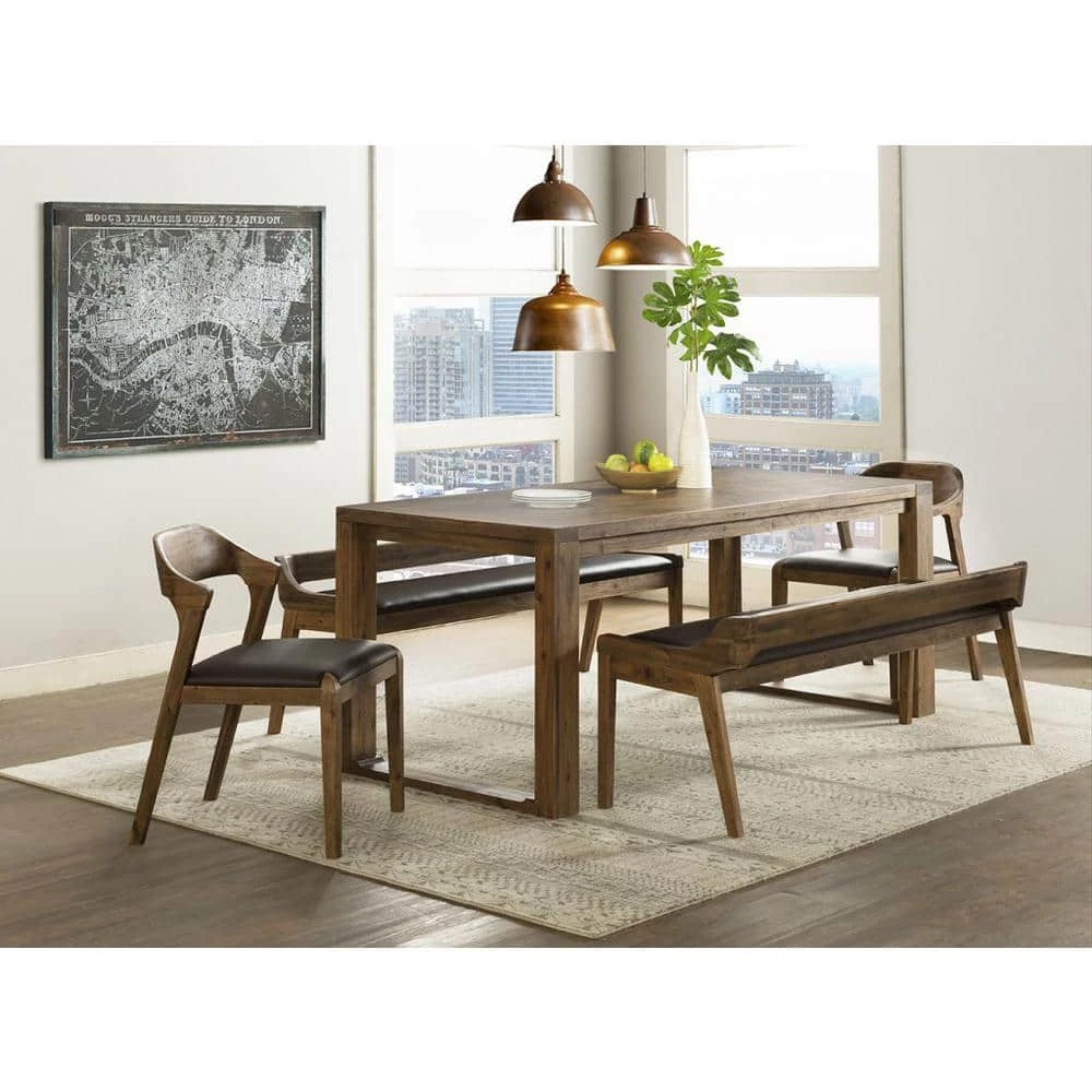 Even larger families can fit comfortably around the Rasmus 5-Piece Dining Set, Table plus 2 Benches plus 2 Side Chairs. This complete dining set fits a family of 6, with room to spare. You’ll get the dining table with built-in extension leaf plus 2 casual dining benches and 2 side chairs. with the extension leaf in place, the table can fit up to 8-people at 1-time. All pieces are constructed from solid Acacia wood which undergoes a multistep wire-brush process to leave behind that distinctive Chestnut finish. The side chairs are also lightly padded and upholstered with faux leather polyurethane. Additional seating combinations with the Rasmus Arm Chairs are also available, so you can customize your dining room to match your family’s needs. Simple assembly is required upon delivery, however the tools and hardware are included for convenience.