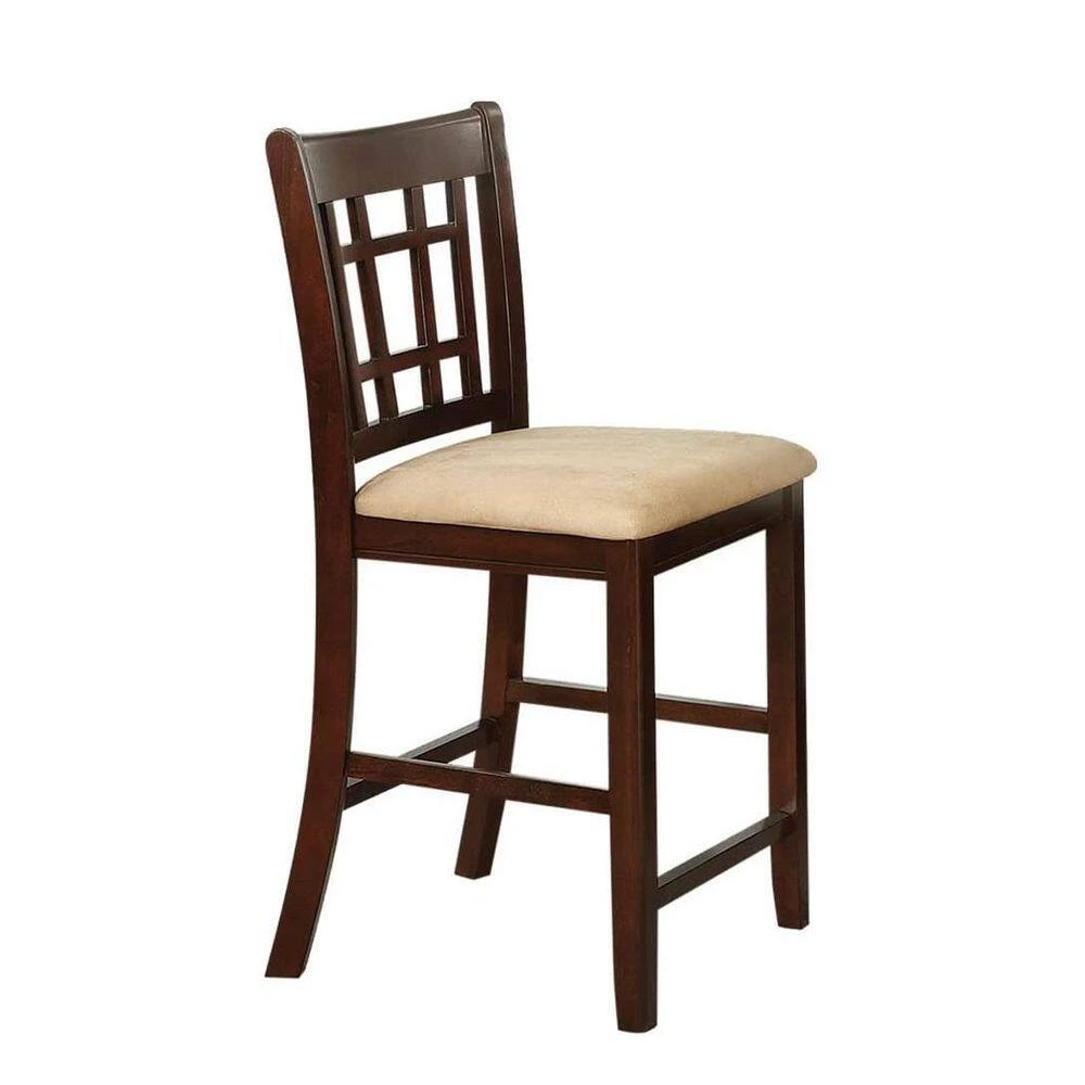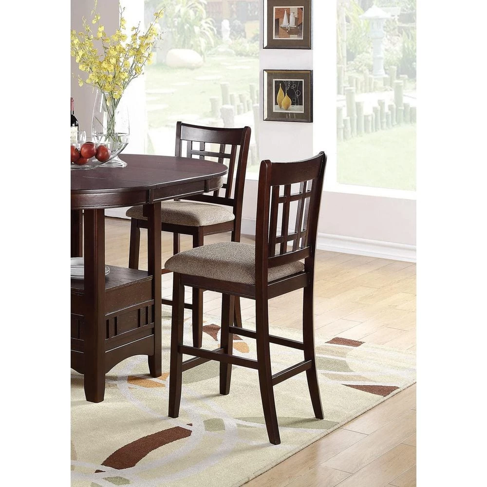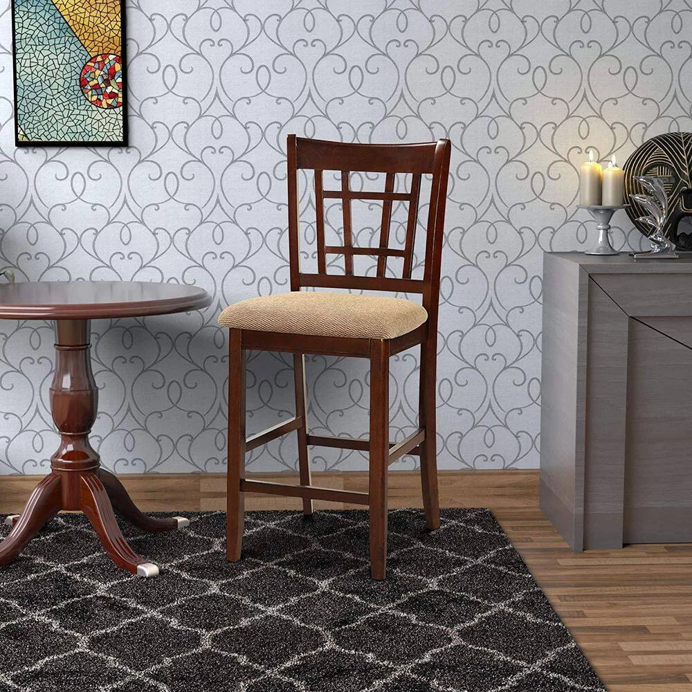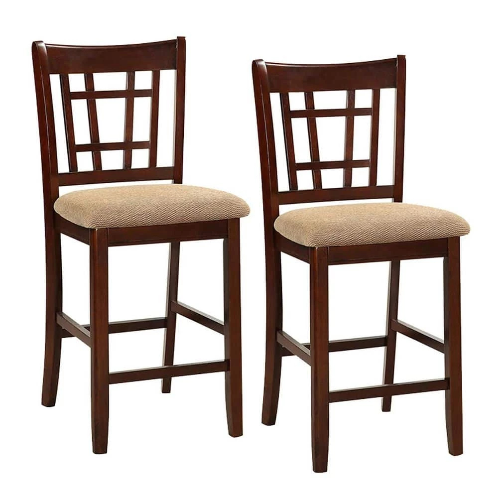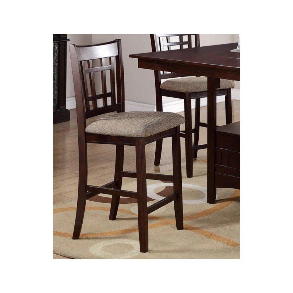 The high chair features a brown finish, clean lined back supports and cushion upholstered seat. It is made of solid wood. These high quality and beautiful counter height chairs will embellish your dining or pub areas. This counter height chair features multiple foot rest heights for varied seating position.