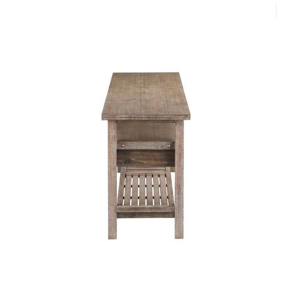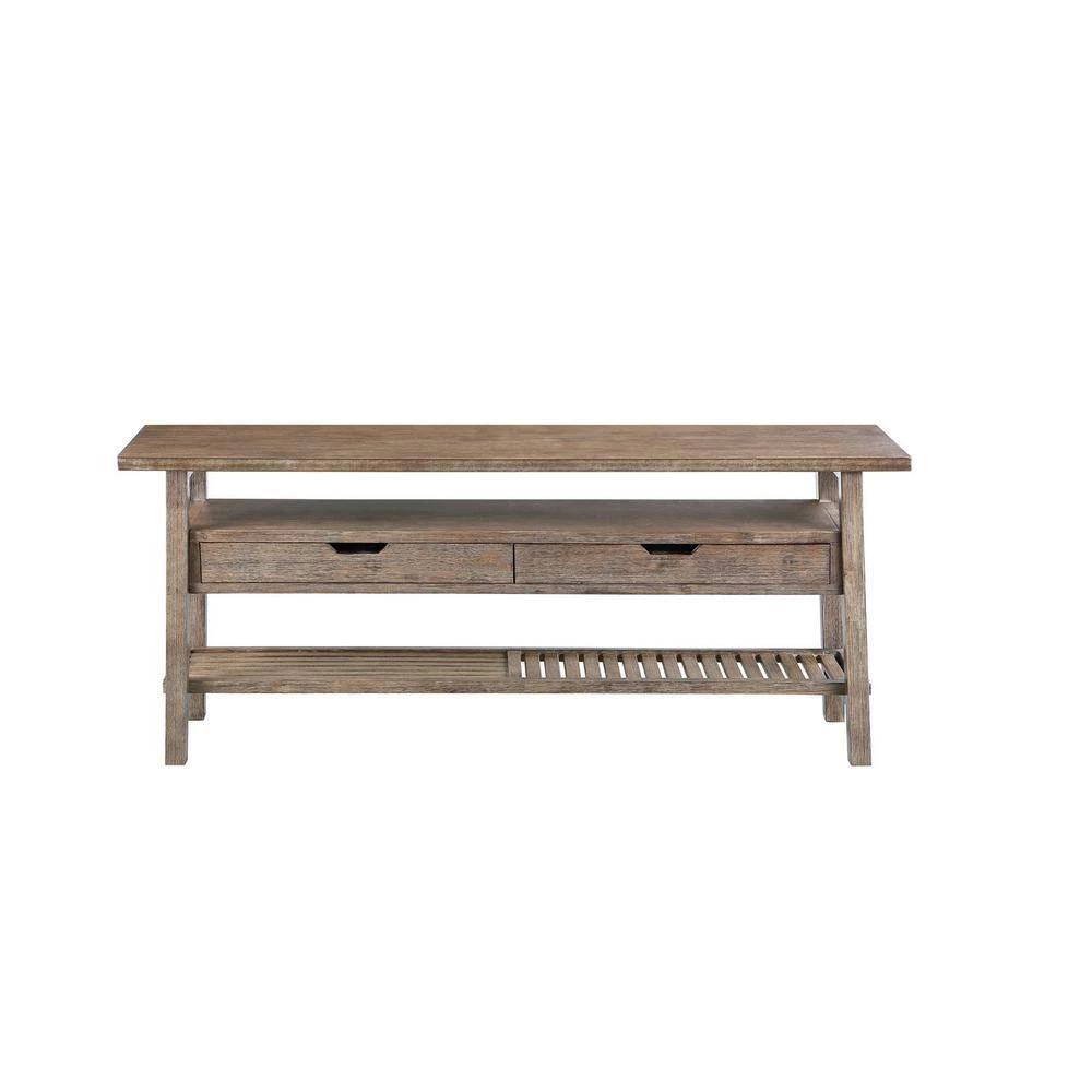 The TV is usually the star of any living room, but the Sonoma TV Stand is ready to give it a run for its money. We can’t get enough of this farmhouse TV stand, which is pushing all of our design buttons: warm Barnwood finish, wire-brushed wood grain detailing, slatted shelf, and gently tapering A frame. Store your remote controls and other odds and ends inside the two drawers, then use the bottom shelf for displaying decorative items or additional accessories. Take advantage of the space between the drawers and the tabletop to store DVD players, game consoles, cable boxes, and any other media needing wire management. This entertainment console is made with an Acacia wood body and engineered wood veneers.