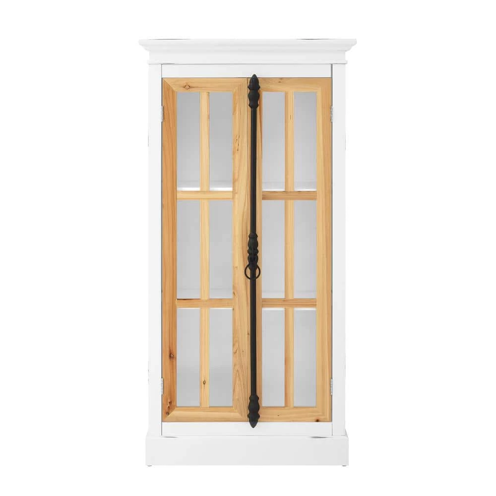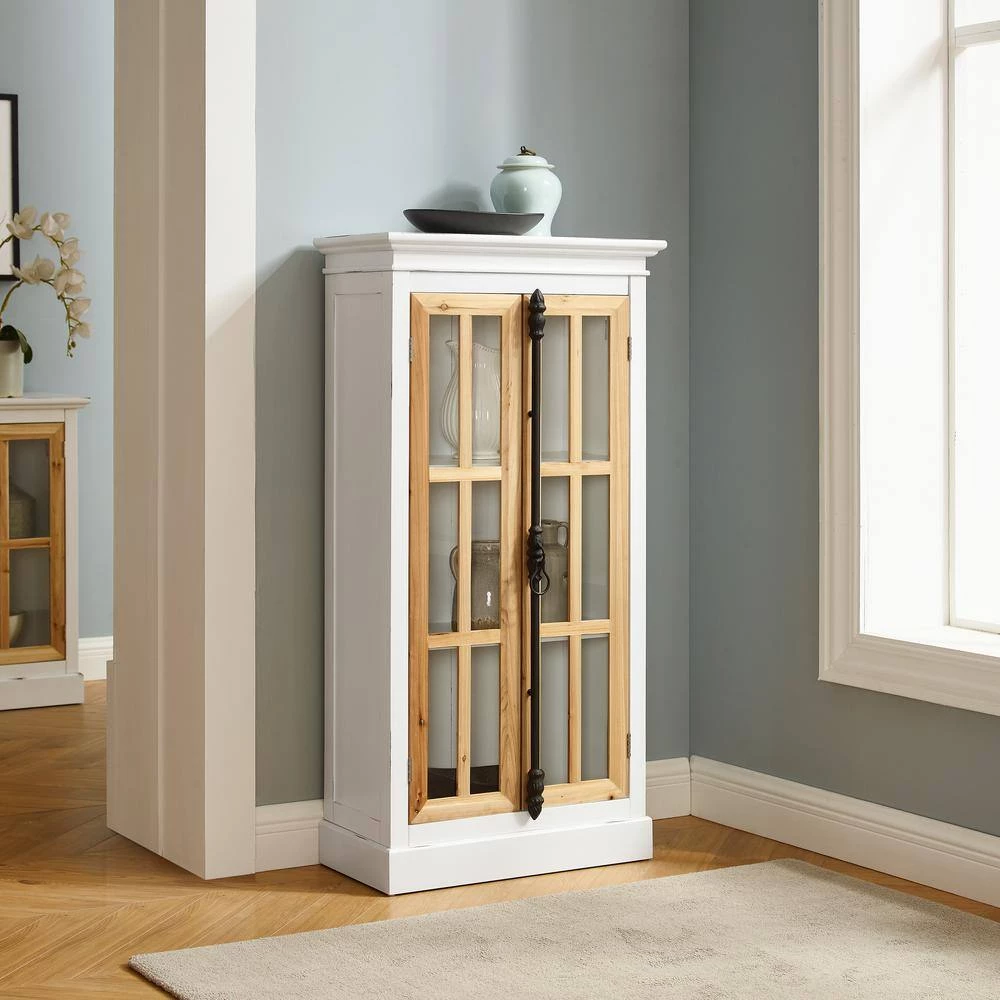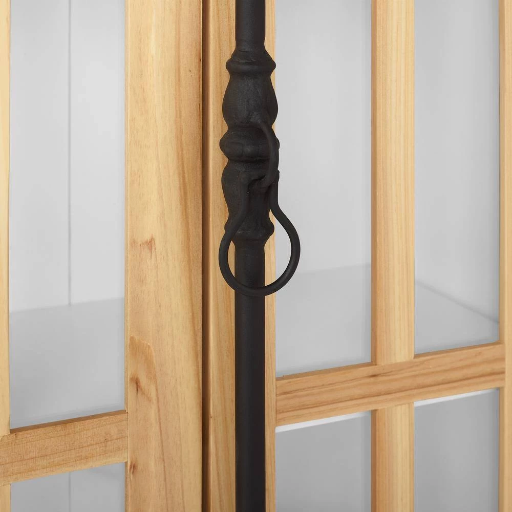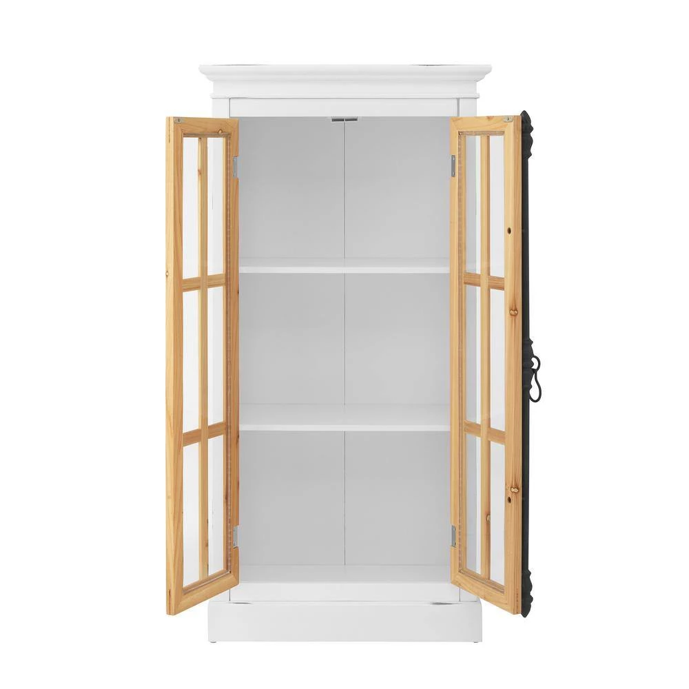 Beautiful black industrial damper handles and natural wood front doors create a striking contrast with your choice of white or black main cabinet paint finishes. Cabinet doors are secured using magnetic hardware door closers. The contemporary tempered glass doors add a touch of designer detail to this display case, with plenty of room to display your favorite china or collection.