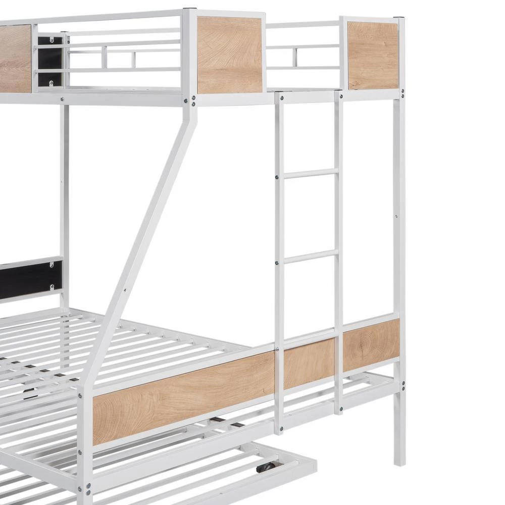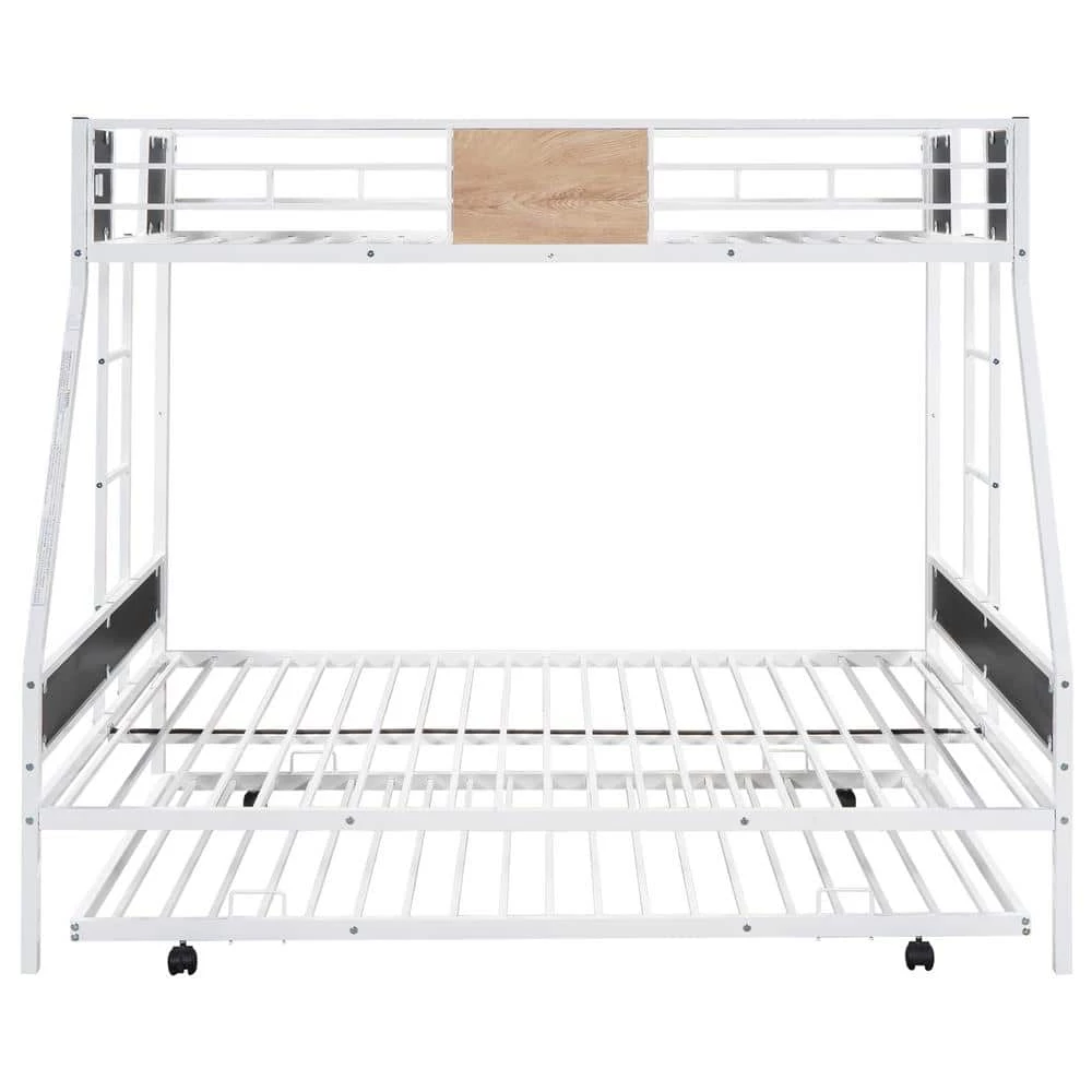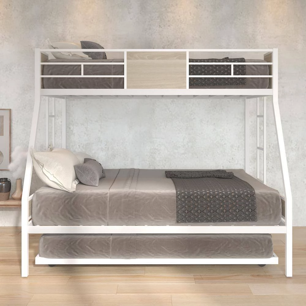 This twin over full bunk bed made by sturdy metal provides extra durability and safety. An extra Trundle is added for guests who stay over night. Additional metal slats support mattresses and extend their life effectively. Full-length guard rails surrounding top bunk keeps you child safe and a good night sleep. It is an excellent space saver. Getting rid of the heavy spring box, extra space under the lower bunk is created for storage. Contemporary design makes it easy to integrate into your bedroom decoration.